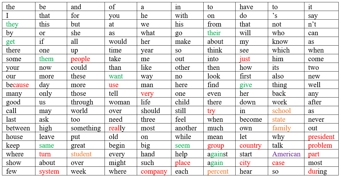 Если вы внимательно прочитали список выше, то наверняка обратили внимание на то, что среди скандинавских заимствований масса распространённых и повседневных слов. Чтобы показать это наглядно, возьмём двести самых частотных английских слов по версии A Frequency Dictionary of Contemporary American English (London, New York: Routledge, 2010) и при помощи цвета промаркируем их этимологию.