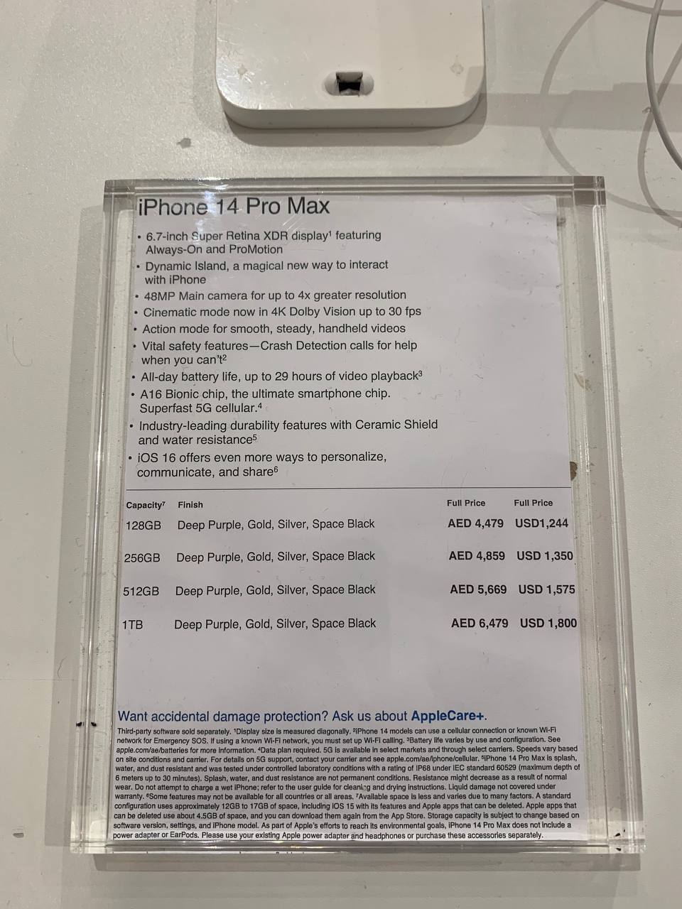 В аэропорту увидела Apple – цены такие же, как и в Москве. Например, Iphone 14 Pro Max 256 GB стоит 4859 дирхам или 111 тысяч рублей.