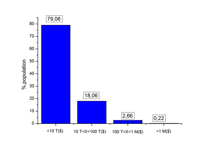 Итак, по данным Credit suisse[1], в середине 2019 года в России численность населения составила около 143 930 тыс человек, из них взрослого населения 111 480 тыс человек. Богатство населения России (финансы+недвижимость-долги) составило 3052 млрд $. Для сравнения, объем золотовалютных резервов РФ на 13.12.19 составил 548, 7 млрд $ [2]. Распределение людей по богатству представлено ниже
