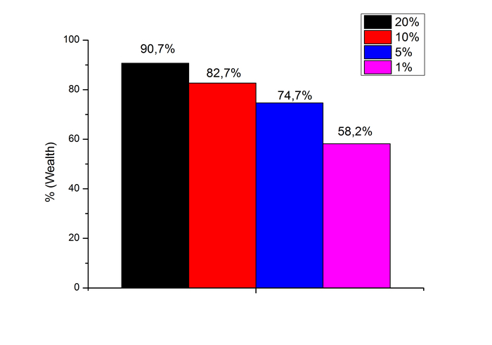 Если, согласно правилу Парето, взять богатые 20%-ов из всех взрослых россиян, то увидим следующее распределение. По оси Y приведены проценты от всего богатства населения РФ.