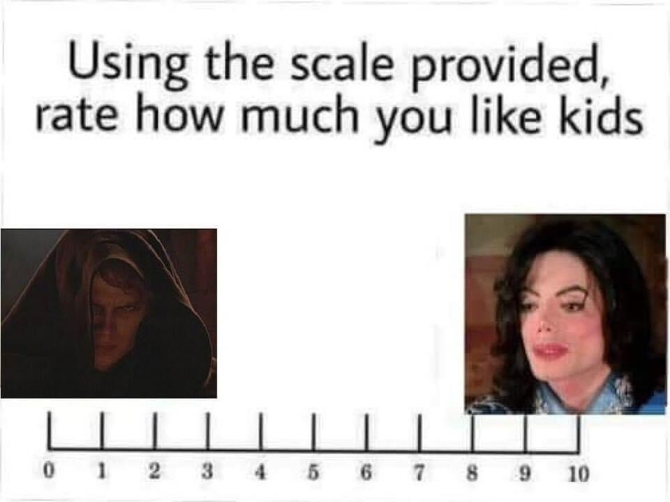 5 justfel Насколько вы любите детей по шкале от 0 до 10 1 месяц назад Мемы Юмор Черный юмор Майкл Джексон Энакин Скайуокер Повтор Дети 1 Ещё 0