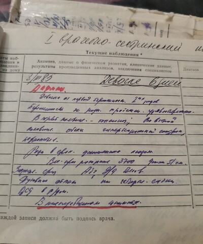 Нашла свою детскую карточку. С прививками и всякими болячками. И очень интересная схема с совершенно нечитаемыми надписями. Врачебный почерк.
