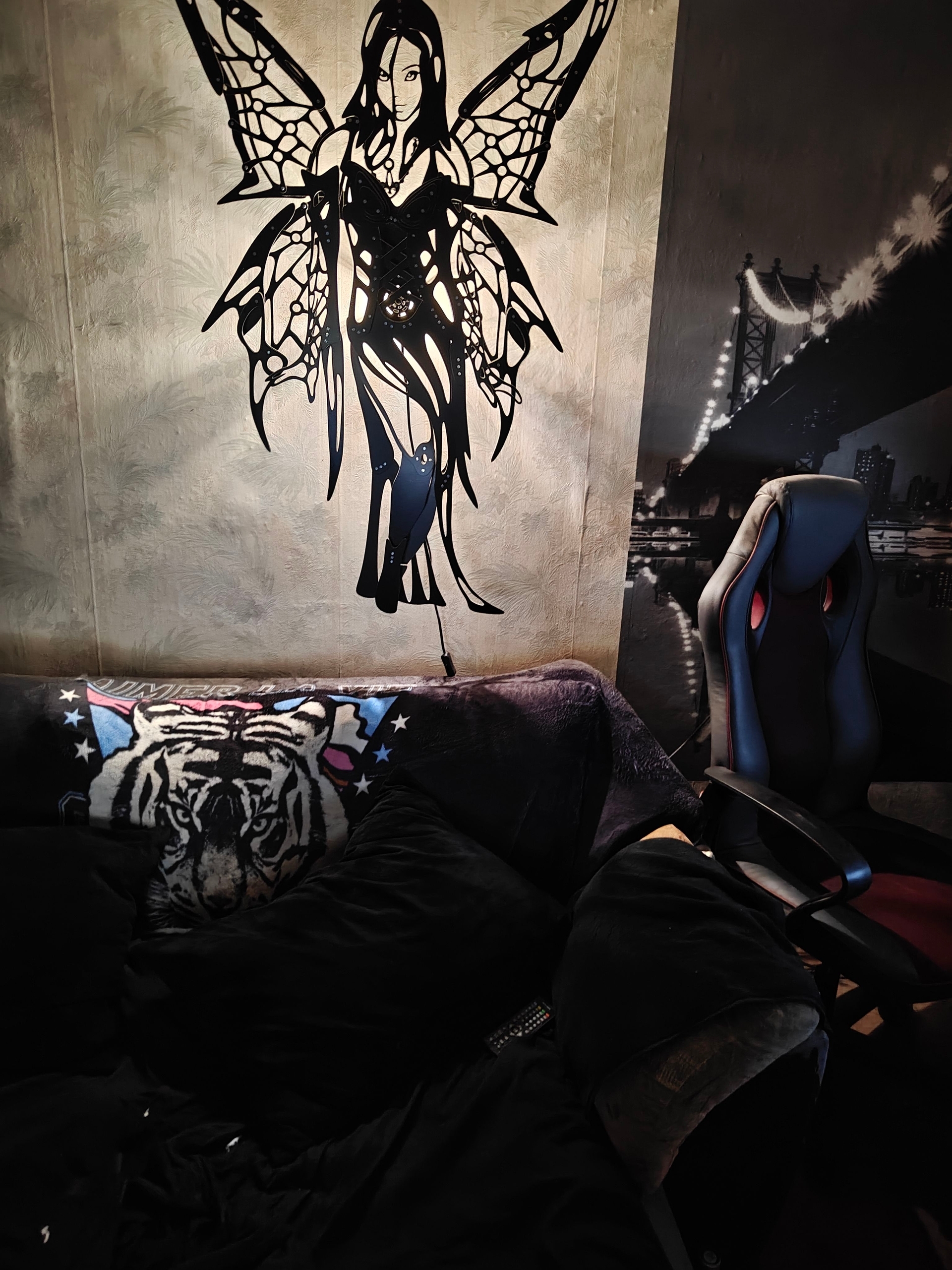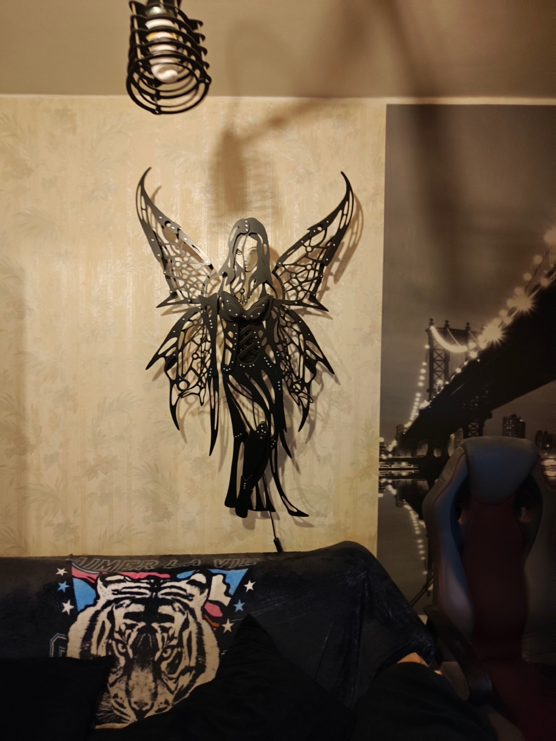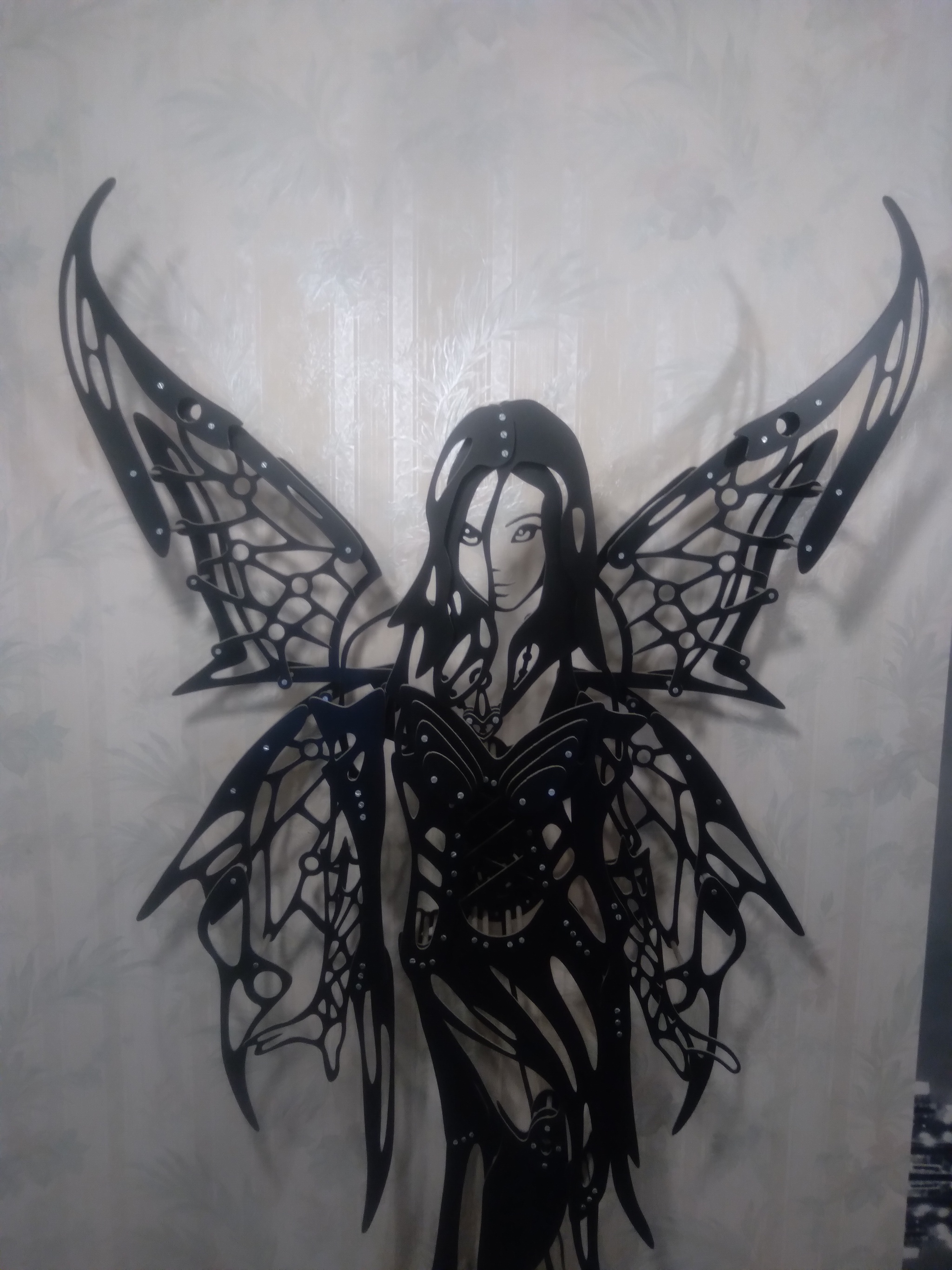 В 2019 году сделал себе настенное панно. Чертежи делал в CorelDRAW (для лазерной резки). Потом порошковая окраска, цвет чёрный матовый RAL9005. Проект собирал в Blender для предварительного просмотра. Вес панно 9 кг, больше 200 винтов и крепёжных стоек, есть подсветка. Проект был сделан по картине художницы из Великобритании Энн Стоукс. Немного про неё: