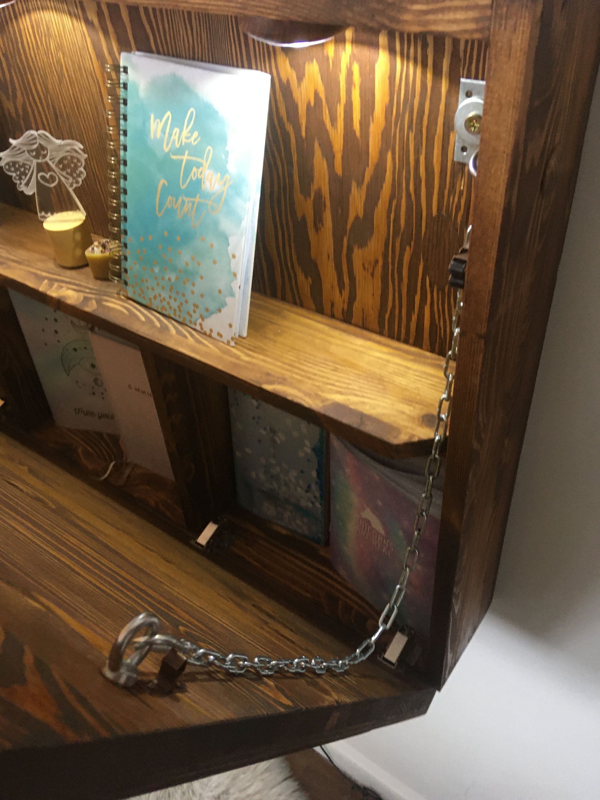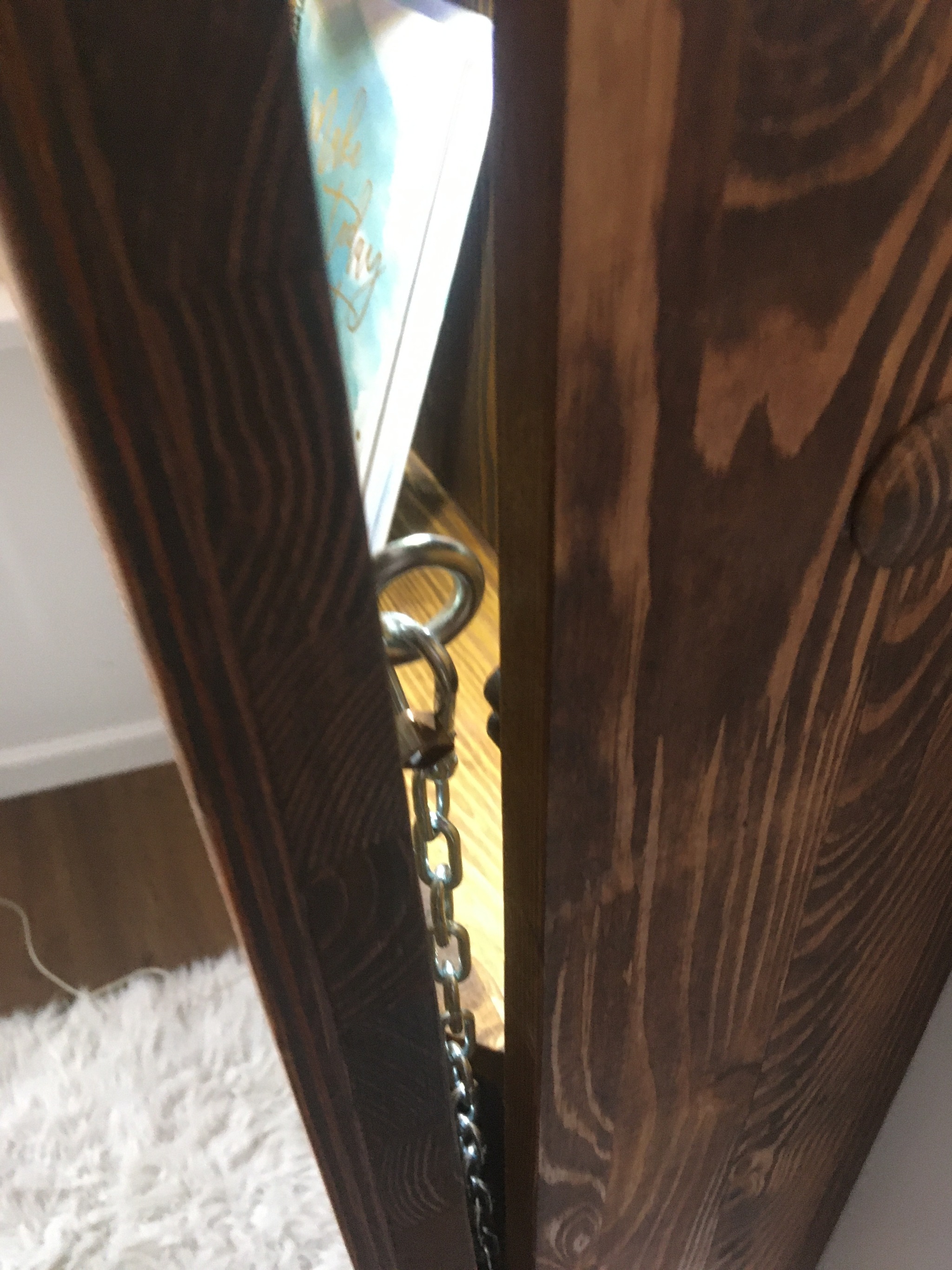 Да там все на коленке можно собрать, фанера 9мм из лиственницы, 300-й мебельный щит 18мм на полки и корпус, 600-й мебельный щит на столешку, 4 серьги м6, 4 ответные шайбы м6, 4 петли, 4 карабина, 2 дверных фиксатора, 2 мощных уголка, цепь и 2 анкера. Разпускаем щит на 120 мм доски, фанеру вырезаем в размер со столешкой, в столешке делаем сквозные отверстия под серьги, ставим ответные шайбы, склеиваем фанеру на фасад и столешку, дальше сколачиваем корпус и полки, я делал нейлером и столярным клеем, было влом заморачиваться со шкантами, а саморезы портят внешний вид. Крепим петли, примеряем дверку, разбираем, вышлифовываем 80-240 и кроем маслом, в данном случае белинка палисандр, даем просохнуть, чуть полируем, собираем и монтируем по месту)