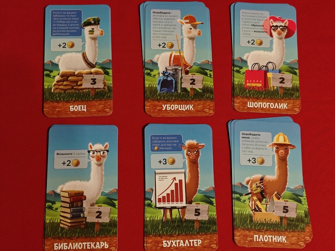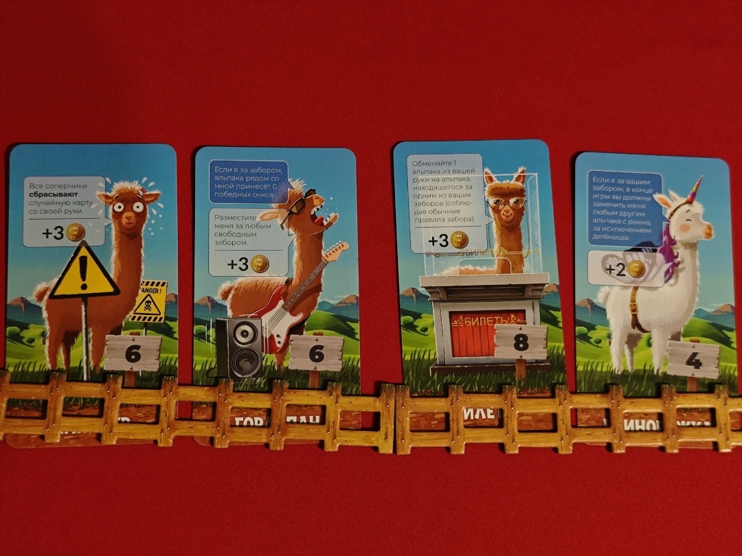 Но на рынке вас встретят уже более продвинутые карты с самыми разнообразными свойствами: возможность добирать карты, покупать новых альпака дешевле, размещать больше одного альпака за забором и так далее. В игре очень много различных видов карт.