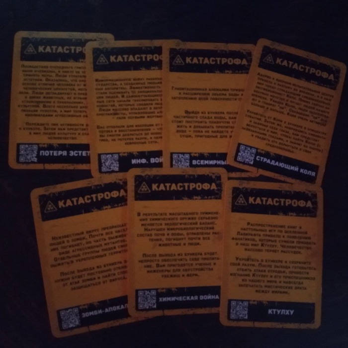 Каждый игрок получает рандомный набор из семи карточек в которых раскрывается вся его личность. В течении пяти раундов игры эти карточки открываются по одной, и каждый доказывает свою полезность в зависимости от того, что имеется в рамках данной катастрофы. В любой момент можно использовать карточку "особое условие", чтобы помочь себе или подгадить другим, а последняя, самая "неудобная", открывается, когда уже место в Бункере получено.