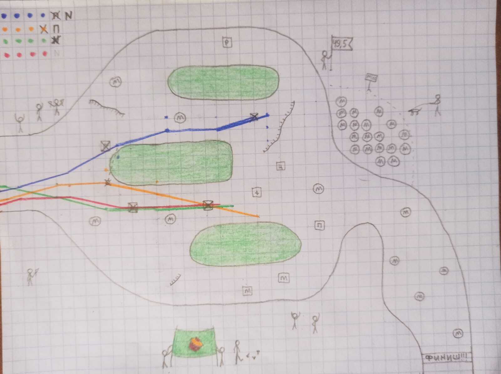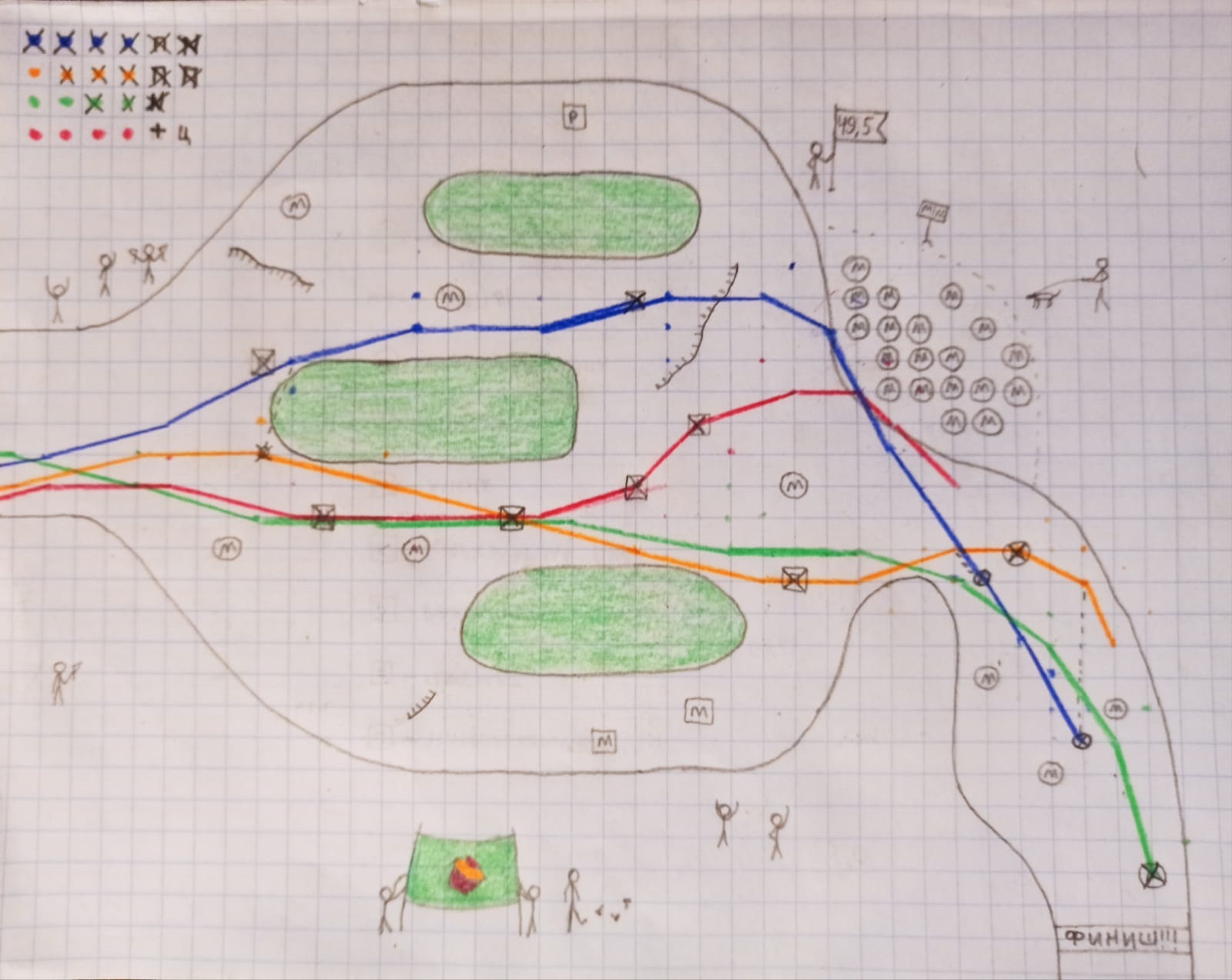 *Да, я знаю, что нитро у синего была включена не по правилам, но я забыл об этом, а когда вспомнил, то было уже поздно, а цветные карандаши не стираются. Поэтому на моменте, когда я обнаружил, что синий смухлевал, а при реальной игре может произойти такая ситуация, когда игрок пошел не по правилам просто забыв учесть что-то, то синий получит штраф: -2 здоровья и -2 скорости, так как будто он тогда заехал в минное поле за пределы трассы.*