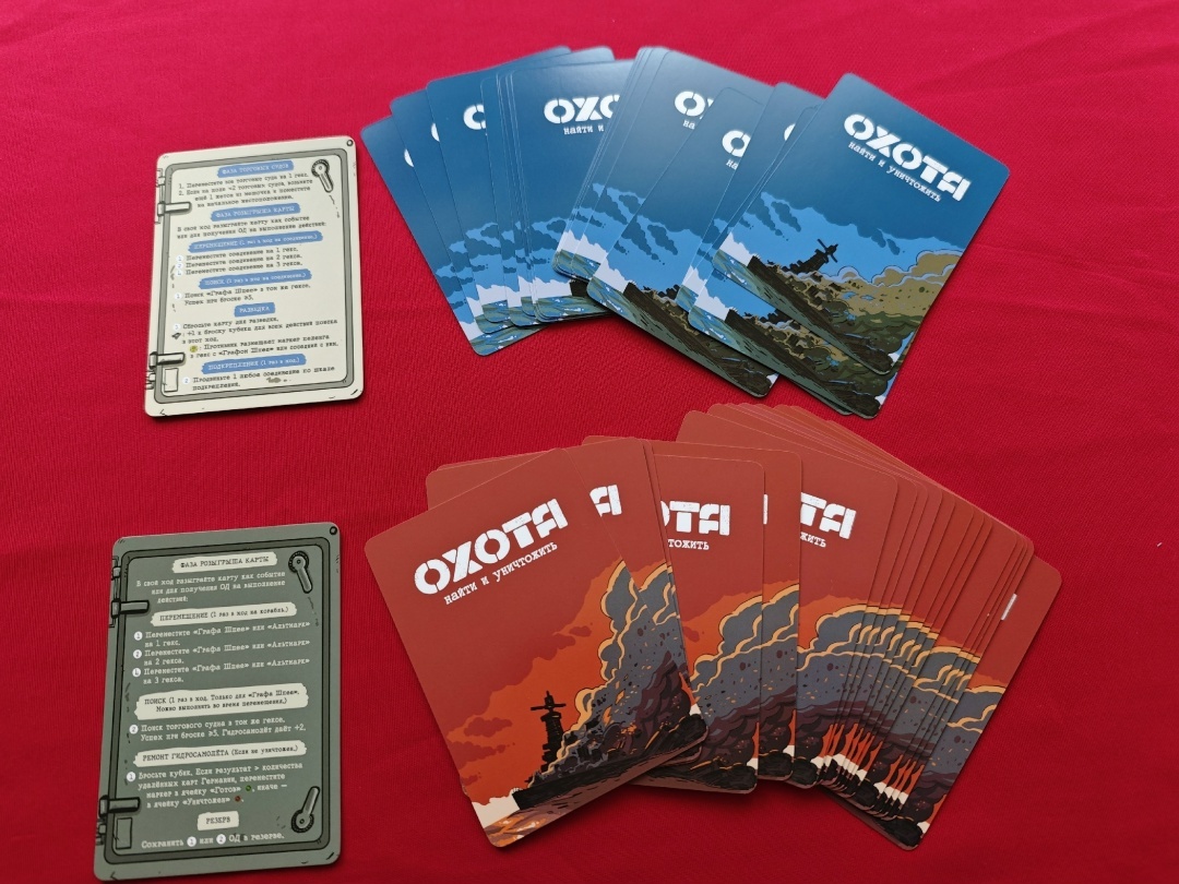 Игрок за Германию должен потопить пять торговых судов и при этом успешно скрываться от соединений противника. А игрок за Британию должен найти "Адмирала Графа Шпее" и уничтожить его в решающем бою. Думаю, уже понятно, что Охота - это игра со скрытым перемещением или кошки-мышки.