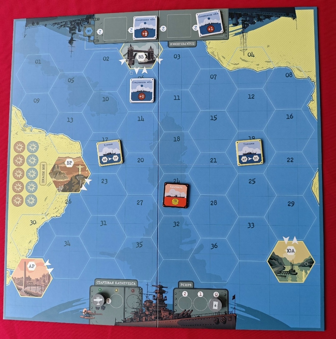 В начале партии у игрока за Британию два торговых судна на поле. Их может быть и больше, но если их станет меньше двух, он добирает жетон (или жетоны) судна из мешочка. Также британец получает один жетон соединения и выкладывает на поле. Остальные два располагаются на шкале подкрепления. Соединения ему понадобятся, чтобы искать главный корабль Германии.