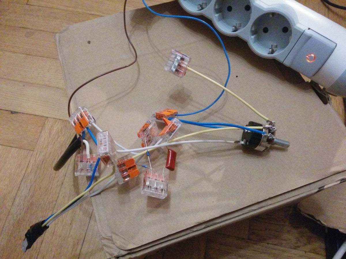 Провода вытащил из обрезка кабеля ВВГ, для тестирования собрал на коннекторах wago, вид психоделичный.