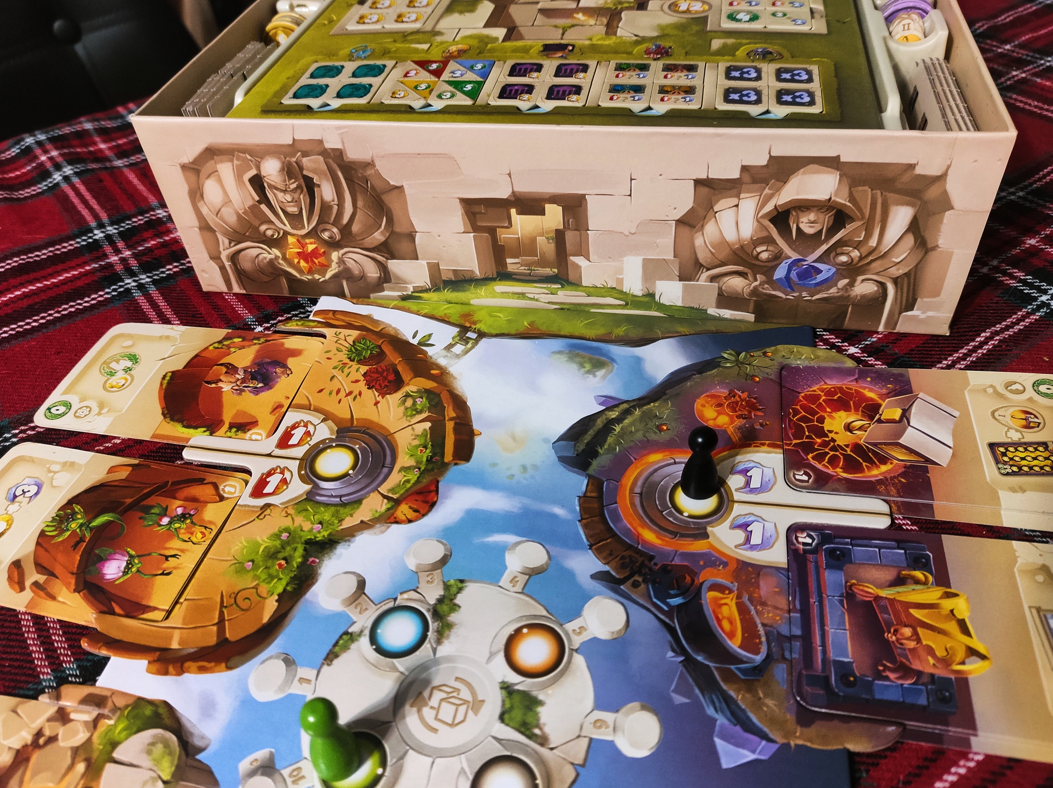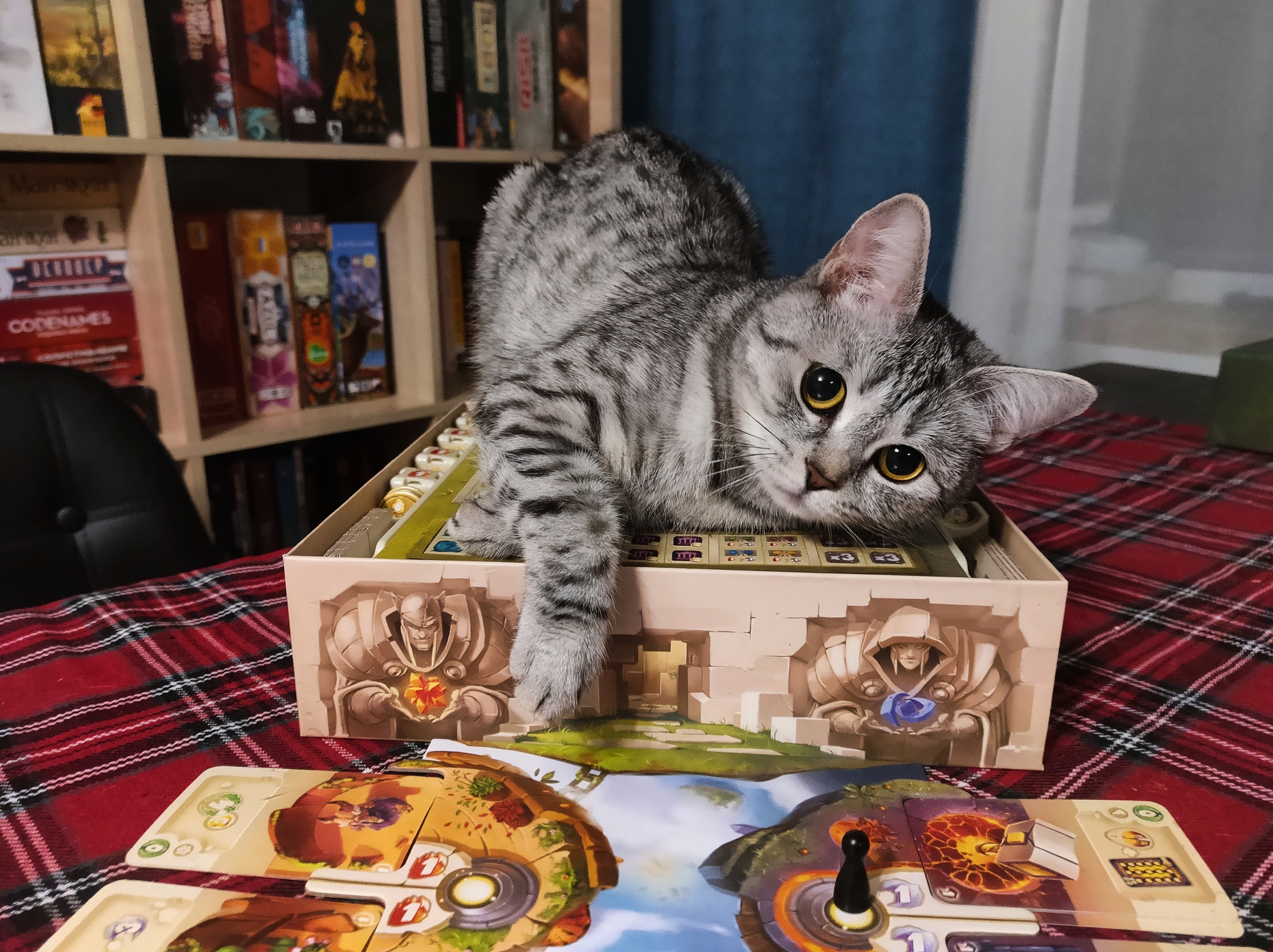 Продакшн тоже на высоте! Органайзер, удобнее которого я ещё не видел, приятные компоненты и арты. Сама коробка – это храм, от которого идет игровое поле. И карты тоже соединяются в единый арт с игровой картой. Одни плюсы у игры – честное слово :)