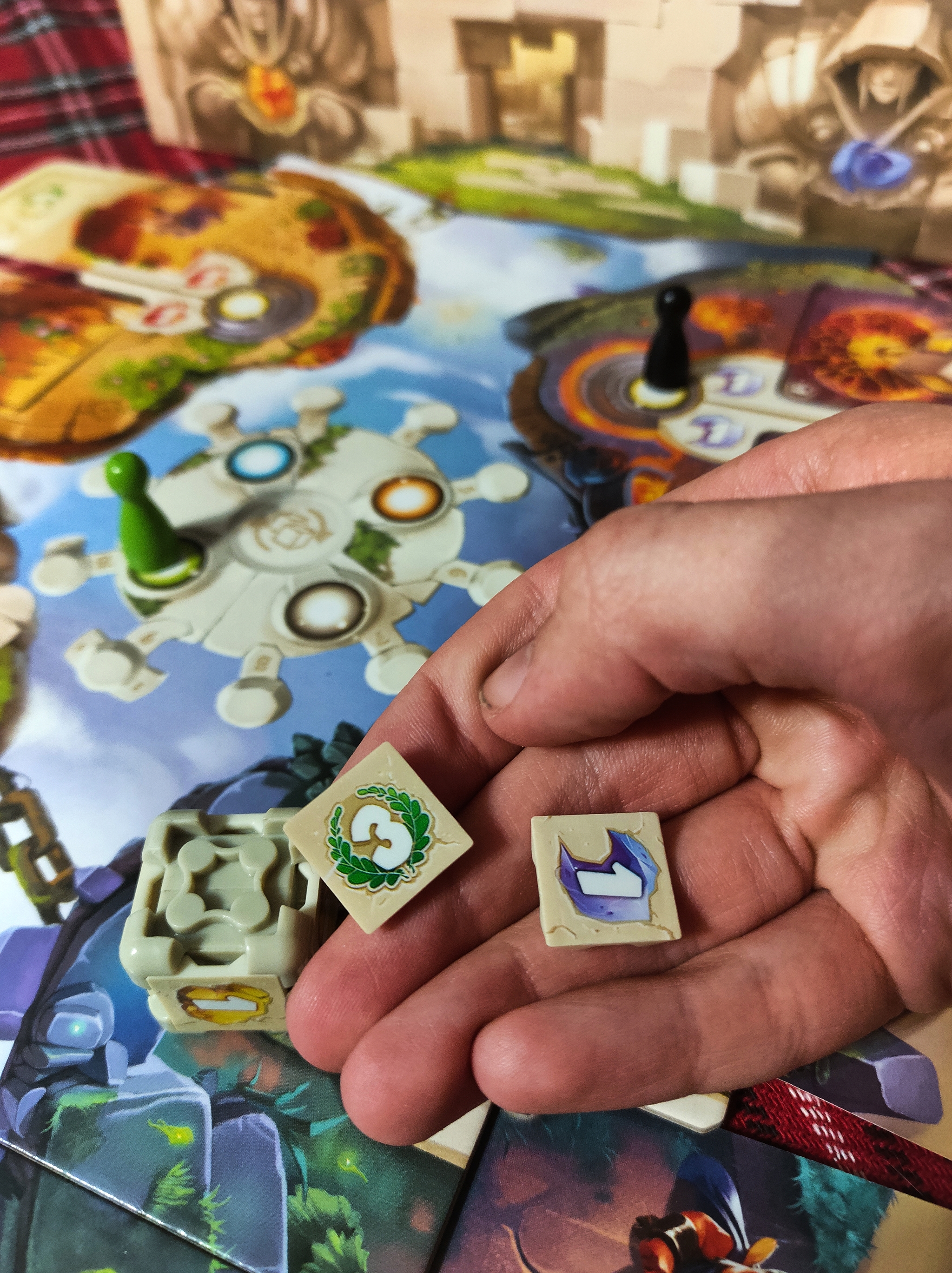 Главная фишка игры – это кубики, грани которых можно менять. В целом, на этом и строится вся игра. Вы бросаете кубики – получаете ресурсы. И тратите их, чтобы поменять базовые грани на прокачанные. Игра идет на победные очки. И какой же кайф, когда на кубиках падают грани с ПО. Да, такие тоже продаются!