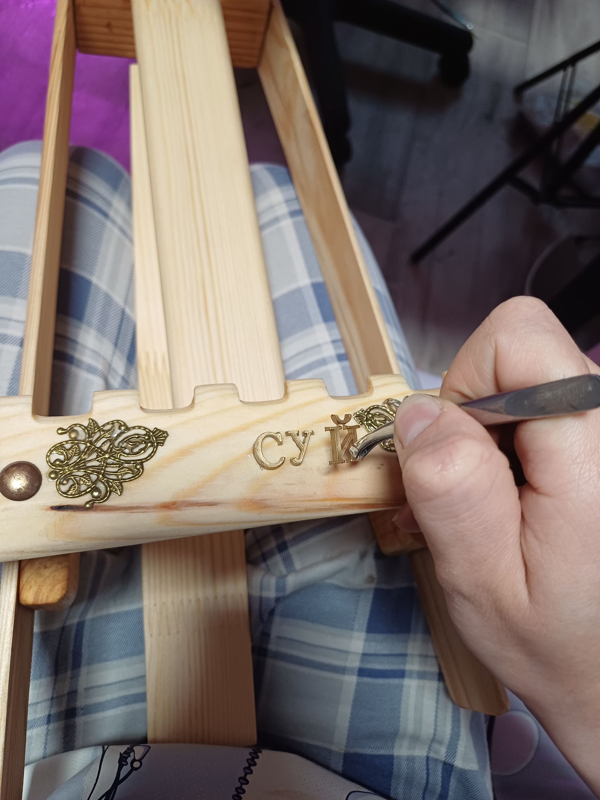 Буквы отлила из эпоксидки ещё какое-то время назад. А сейчас, вот, пригодились. Покрыла жидкой поталью заданного колера и... чпоньк.