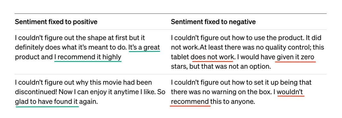 OpenAI в этом плане двигались постепенно — первые проверки гипотезы о том, что языковая модель при обучении строит модель мира, помогающую ей успешно предсказывать следующее слово, были ещё до GPT-1. Исследователи предположили, что если взять достаточно большую по тем временам модель, и обучить её на 40 Гигабайтах отзывов с Amazon (при этом не показывая, какой рейтинг оставил пользователь — только текст), то скорее всего нейросеть сможет сама «изобрести» внутри себя концепцию сентимента. Иными словами, она сможет определять, является ли отзыв позитивным или негативным. С учётом того, что в явном виде мы никак эту информацию не сообщаем — было неочевидно, получится ли разобраться со столь сложной и абстрактной вещью, которая существует только у нас в голове: сентимент текста. Ведь это не природное явление, не закон физики — это то, как мы, люди, придумавшие свои искусственные языки, воспринимаем информацию.