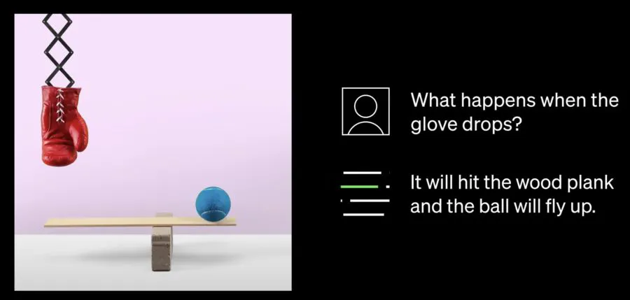 GPT-4 вообще удивила многих. Вот как думаете, можно ли ответить на такой вопрос к следующей картинке, не понимая физику нашего мира, не моделируя взаимодействия объектов? Что произойдет с мячиком, если перчатка упадёт?