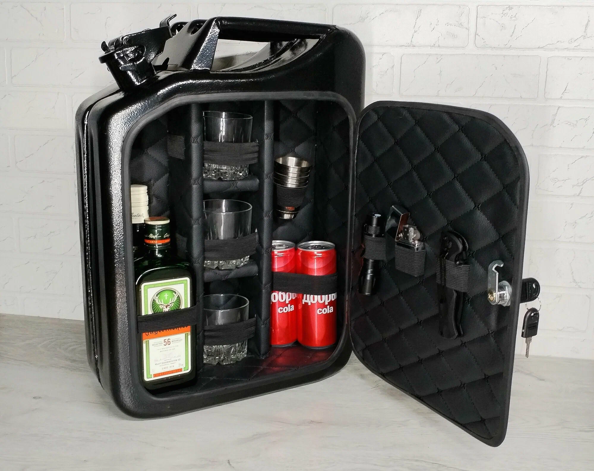 Бар с подсветкой из настоящей металлической 20 литровой канистры с эко кожей и деревом станет необычным подарком мужу, отцу, другу, коллеге, начальнику, брату. Бар из канистры станет отличным тайником-сейфом для любимых напитков и вещей, который можно закрыть на ключ! Ссылка на него