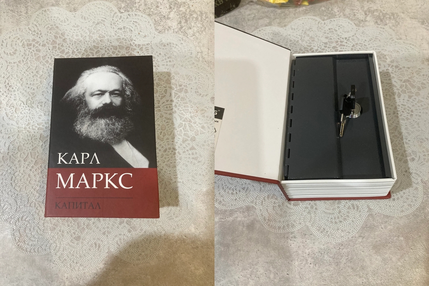 Надежный металлический бокс, выполненный в виде муляжа книги К. Маркс "Капитал", который пригодится как дома, так и в офисе. Он может быть использован для хранения денег (бумажных купюр и монет), драгоценностей, документов и других важных вещей.Ссылка на неё