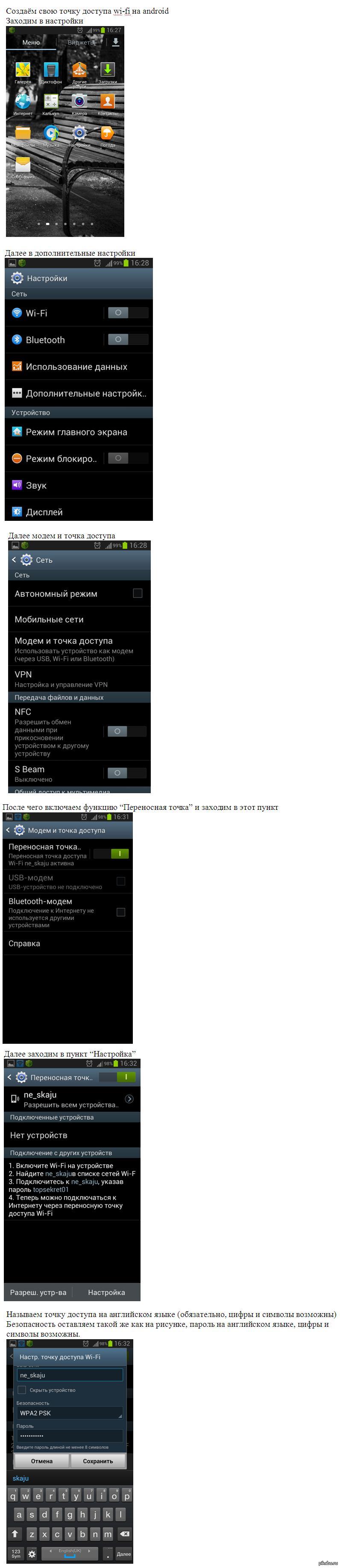 DELETED 12 лет назад Настройка раздачи wi-fi для android(в данном случае 4.1 jelly bean) Может кому будет интересно. Будут вопросы, отвечу по мере возможности. Заскринил и слепил сам. А вообще lejion спрашивал, надеюсь он увидит. [моё] Wi-Fi Настройка Телефон Android 4 Jelly Bean