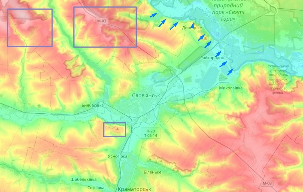 Славянск с севера прикрывает река Северский Донец (синие стрелки), за ним находятся высоты, где удобно разместить артиллерию (фиолетовые прямоугольники). Между Славянском и Краматорском – гора Карачун (отмечена маленьким прямоугольником), которую многие могут помнить по боям первых месяцев АТО, когда еще сам Гиркин-Стрелков оборонял город. Наступать в лоб здесь будет очень сложно, к тому же, есть еще проблема с Часовым Яром, город находится на возвышенности и для ВСУ удерживать его будет едва ли не проще, чем Бахмут: