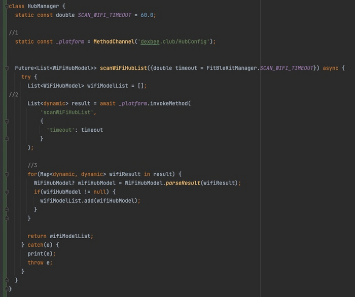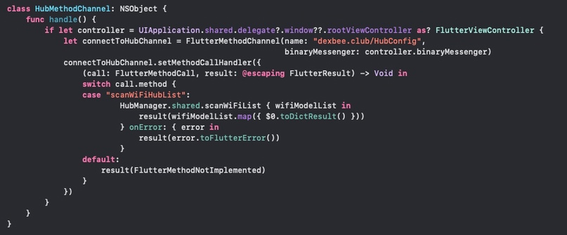 Разберемся. При создании AppDelegate, мы также создаем объект HubMethodChannel и при запуске приложения вызываем у него метод handle. В handle создаем канал с тем же идентификатором, что и во флаттер, и подписываемся на обновления этого канала с помощью метода setMethodCallHandler. У нас только один метод и его название scanWiFiHubList, поэтому ждем его вызов и выполняем нужные нам действия.