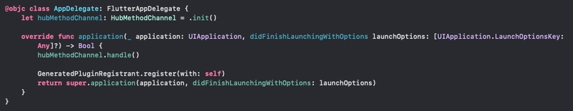 Далее следует сам нативный код. На флаттере был открыт канал с идентификатором, надо на него подписаться. Чтобы разделить логику разных фич, создаём отдельный класс и в нём подписываемся на канал. Идентификатор должен соответствовать. А делаем мы это на инициализации приложения, то есть в AppDelegate.
