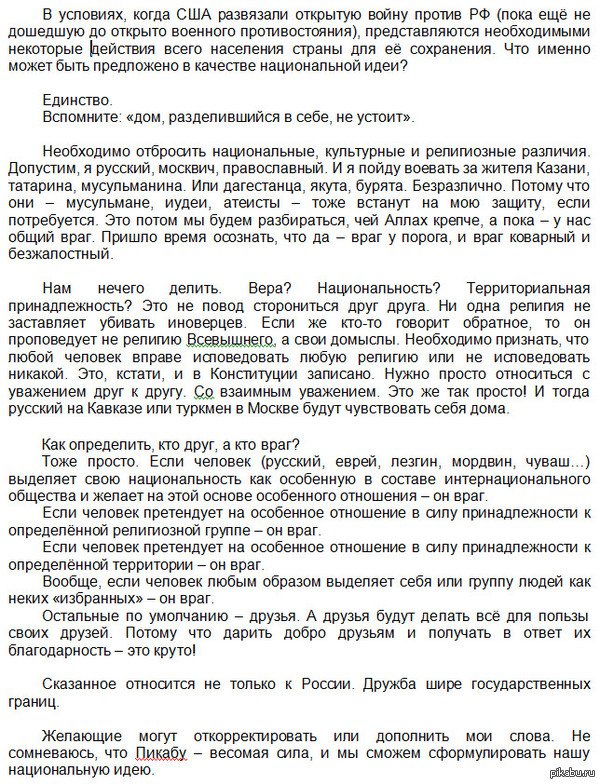 Ну и тем более пока это действительно лишь теория. Где та самая национальная идея? Если ни вера, ни национальность, ни территория не подходят, то что нам остаётся? Я вот действительно не могу придумать ничего такого, чтобы вот прямо объединяло и сплачивало людей. Разве что один большой общий враг. Но мне эта категоричность не сильно по душе. "Кто не с нами, тот против нас". Не хочу я делать такой выбор.