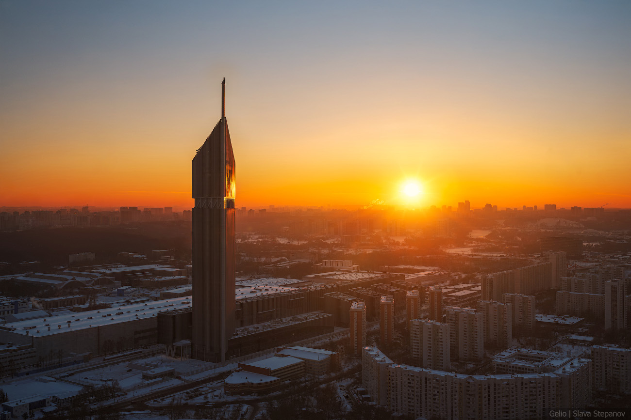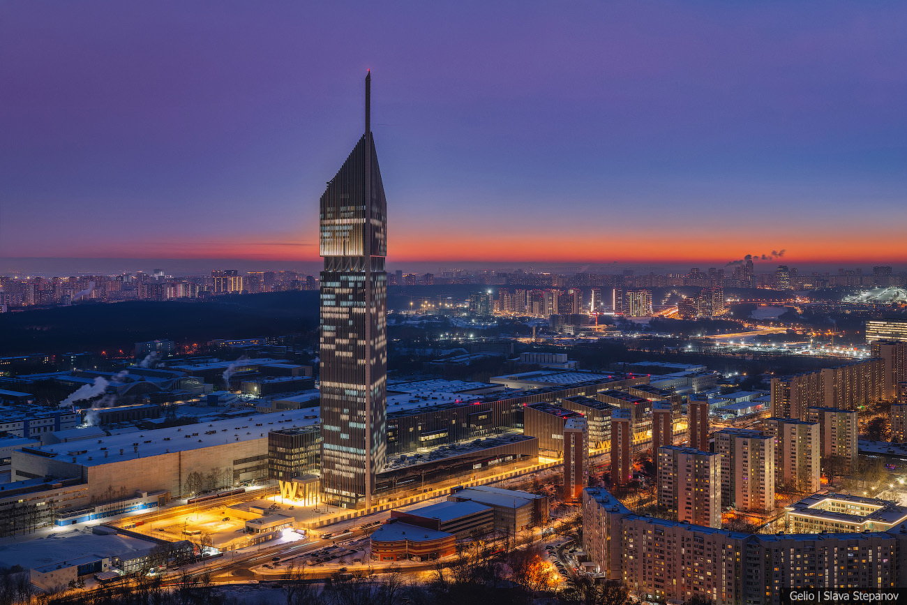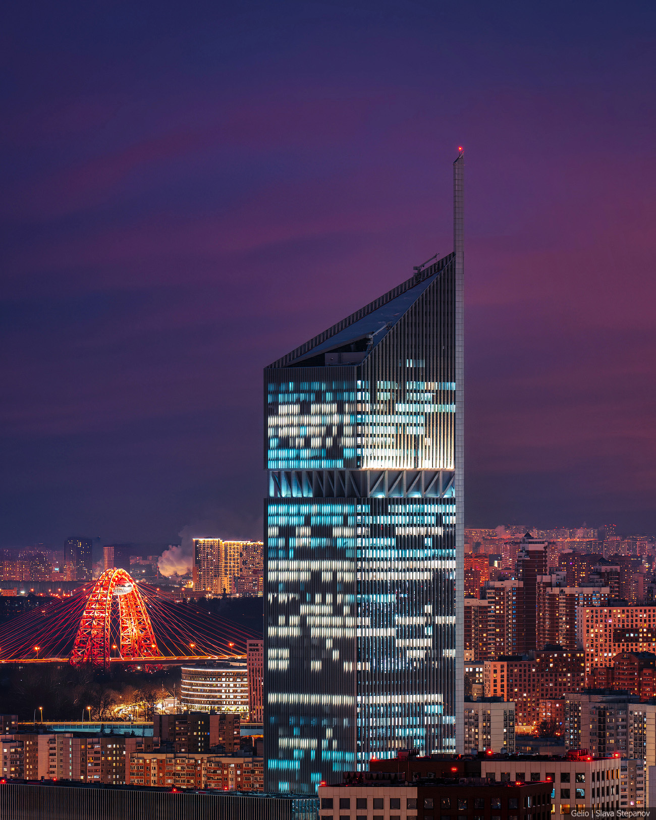 Новая штаб-квартира госкорпорации «Роскосмос» в Москве. Здесь под одной крышей планируется объединить конструкторские бюро и предприятия ракетно-космической отрасли. Доминантой НКЦ стал 47-этажный небоскрёб-«ракета» с треугольным силуэтом и шпилем высотой 288 метров.