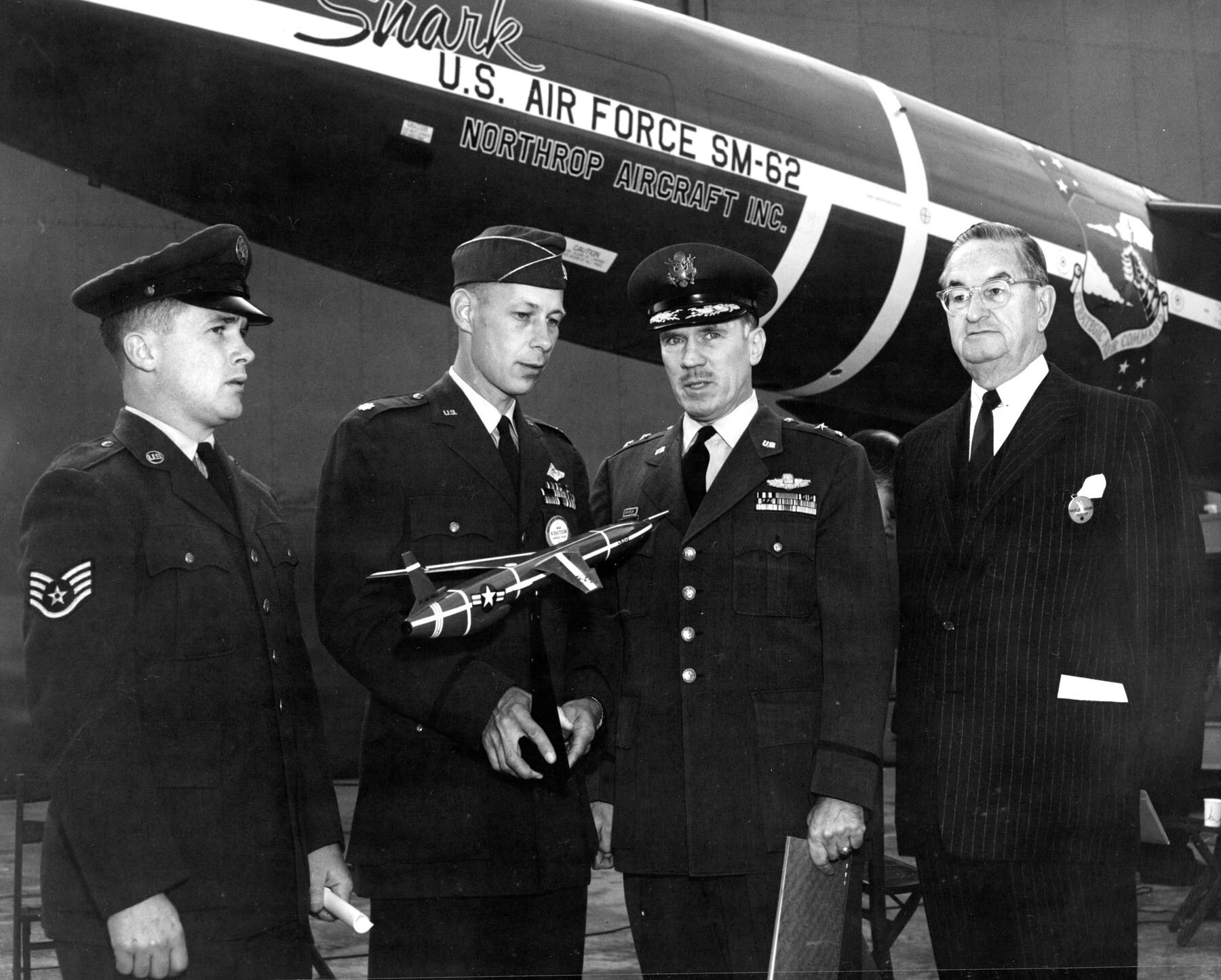 Первая серийная крылатая ракета Snark (SM-62). На её фоне слева направо: штаб-сержант и отличник боевой подготовки Мэйнард Денни; подполковник Ричард Бек, командир 556-й стратегической ракетной эскадрильи; генерал-майор Альфред Келберер, заместитель командующего 15-й Воздушной армией; Уитли Коллинз, президент компании Northrop Aircraft. 12 декабря 1957 года.