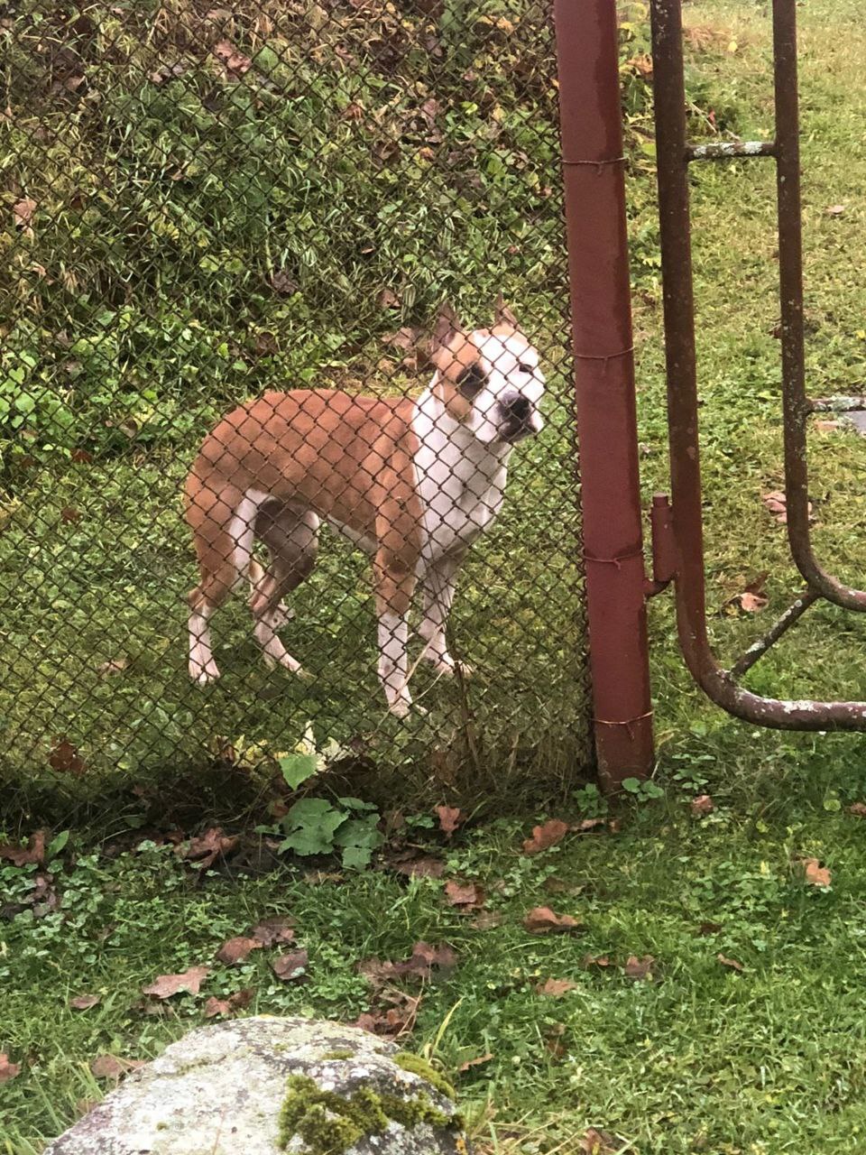 Видно что стафф домашний, надеюсь хозяева ее ищут, а не избавились таким жестоким способом, зимой эта особь на улице не выживет :(