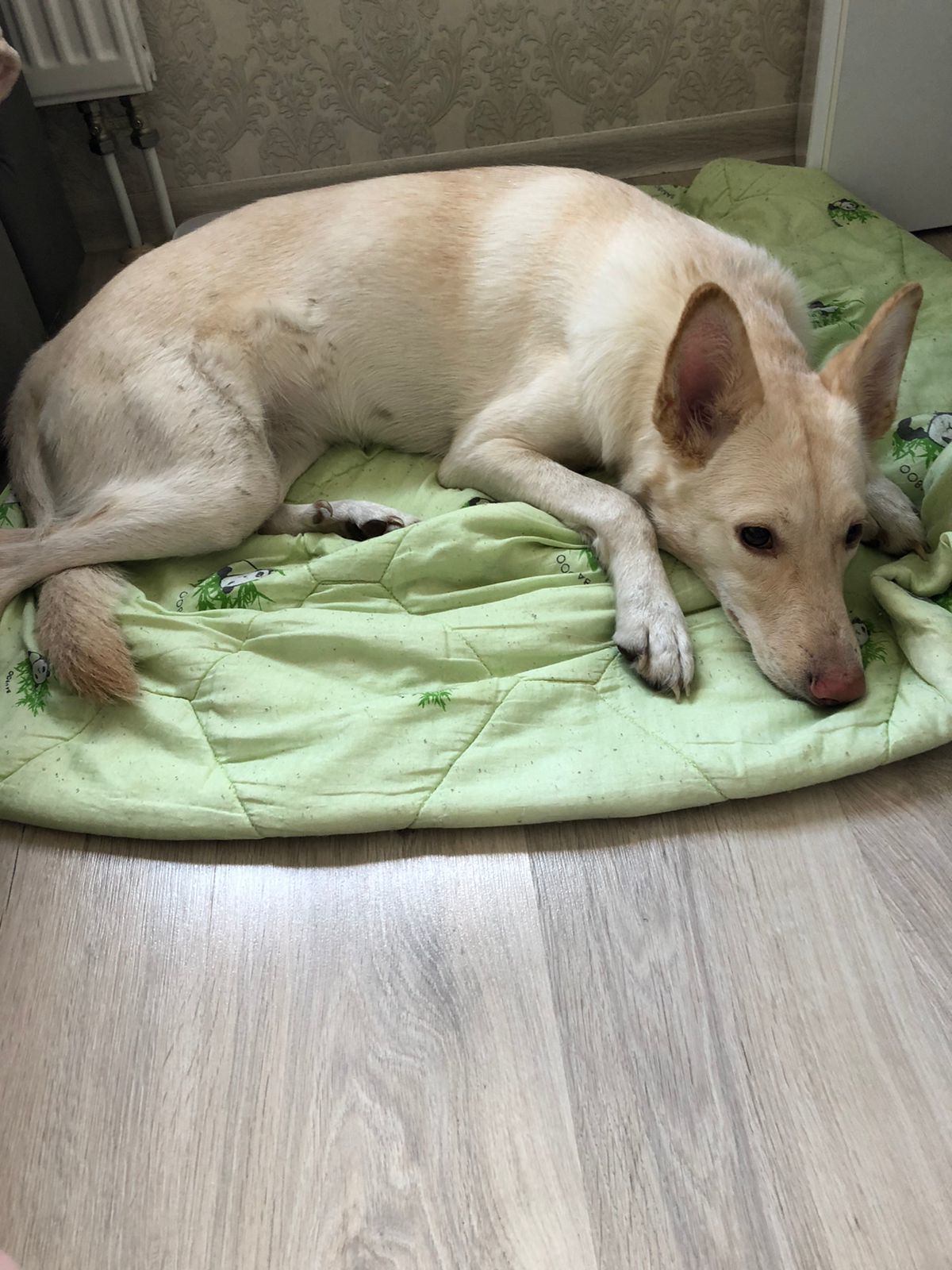 Нашли у подъезда собаку, охрана говорит она уже сутки у подъезда сидит, ждёт. На вид очень ухоженная, чистая, не пахнет. На руки идёт, ласковая, воспитанная, знает команды. Очень боится ходить без поводка, прям трясёт всю. На поводке чувствует себя уверенно