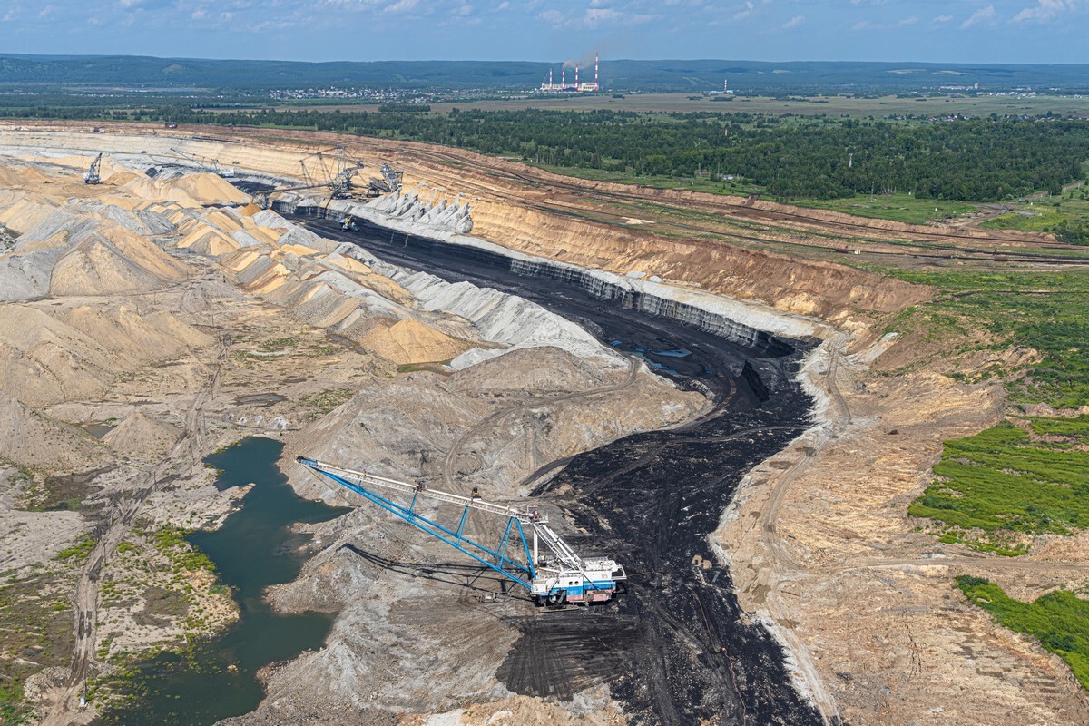 Пласт угля (толщиной около 15 м) лежит под 70-метровым слоем пустой породы (горняки называют его "вскрышей"). Так вот, перед добычей угля эту "вскрышу" надо снять и отгрузить в отвал, затем добывается очередной слой угля, по железной дороге отправляется заказчикам, снимается очередная часть "вскрыши" - и так по циклу. То есть этот разрез представляет из себя примерно трёхкилометровую линию добычи угля, где с одной стороны - многолетний отвал, а с другой - ещё не вскрытые пространства, под которыми лежит этот самый уголь. И эта линия постепенно движется по направлению на восток: