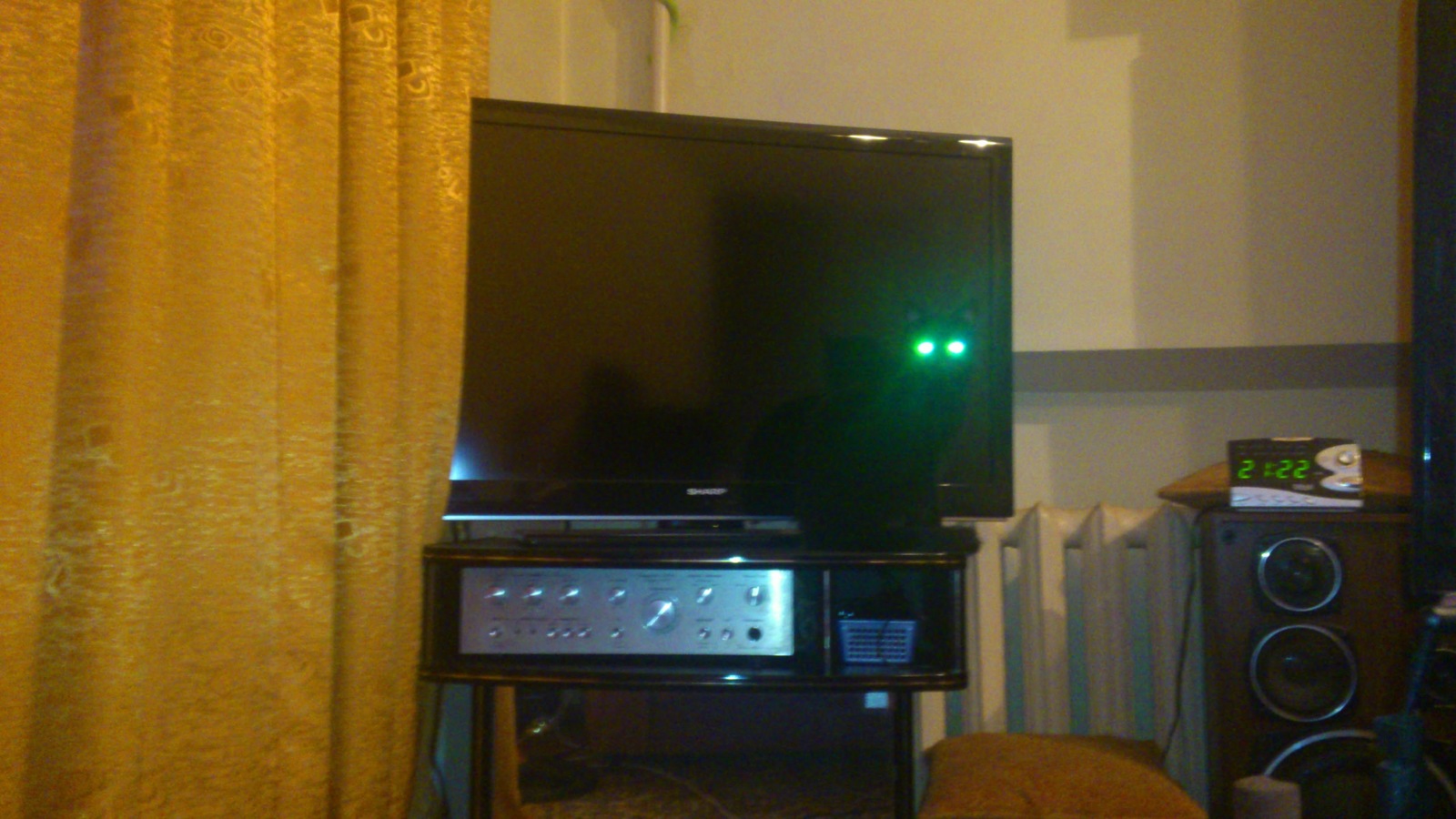 Между прочим к телевизору нет претензий. Только вот на его фоне плохо видно черную кошку. Муж настаивает для полноты картинки заменить и тумбочку под ТВ, чтобы совсем не найти Лушку.