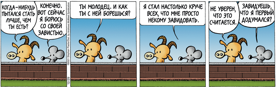 Если присмотреться, можно заметить, что у Козла меняется расстояние между рогами, так что, строго говоря, здесь две пары одинаковых Козлов и Крысов, а трава и кладка забора отличаются во всех кадрах.