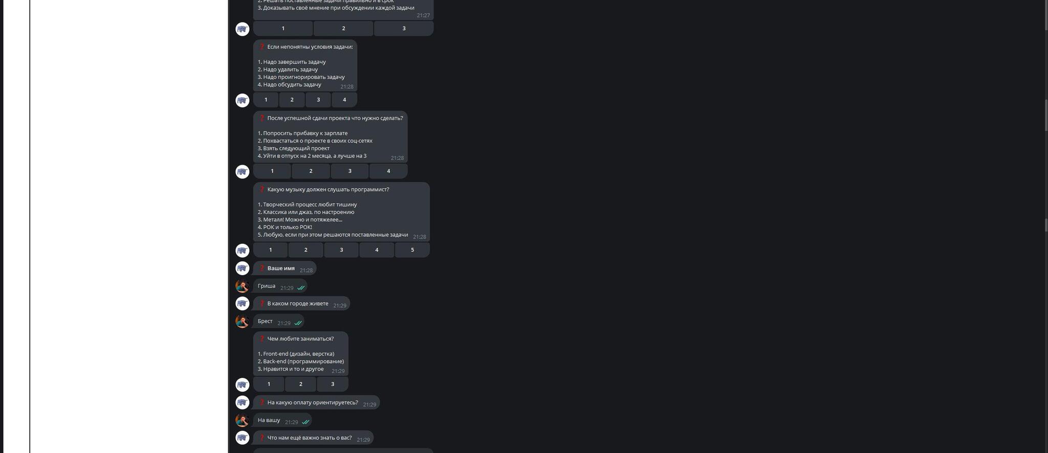 Сначала надо, чтобы тебя заметили. Тебе через полсекунды отвечает бот. Бот который предлагает пройти тест. Тест в котором согласно психологических книг главные вопросы седьмой и девятый, в которых отчетливо написана "клятва работать в срок" (то есть дать согласие, что при любом удобном поводе тебе можно не платить вообще), не дав которую - ты не проходишь.