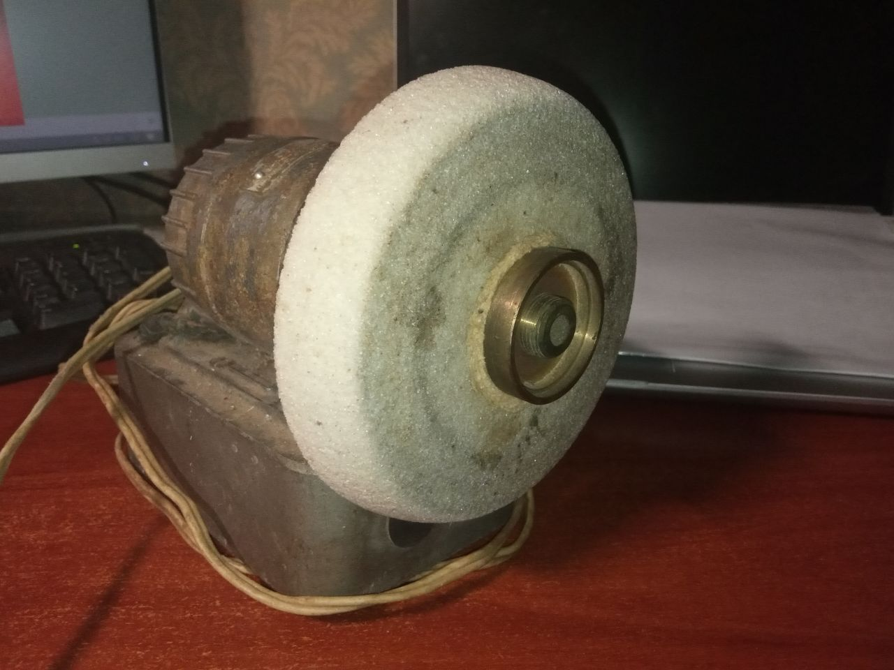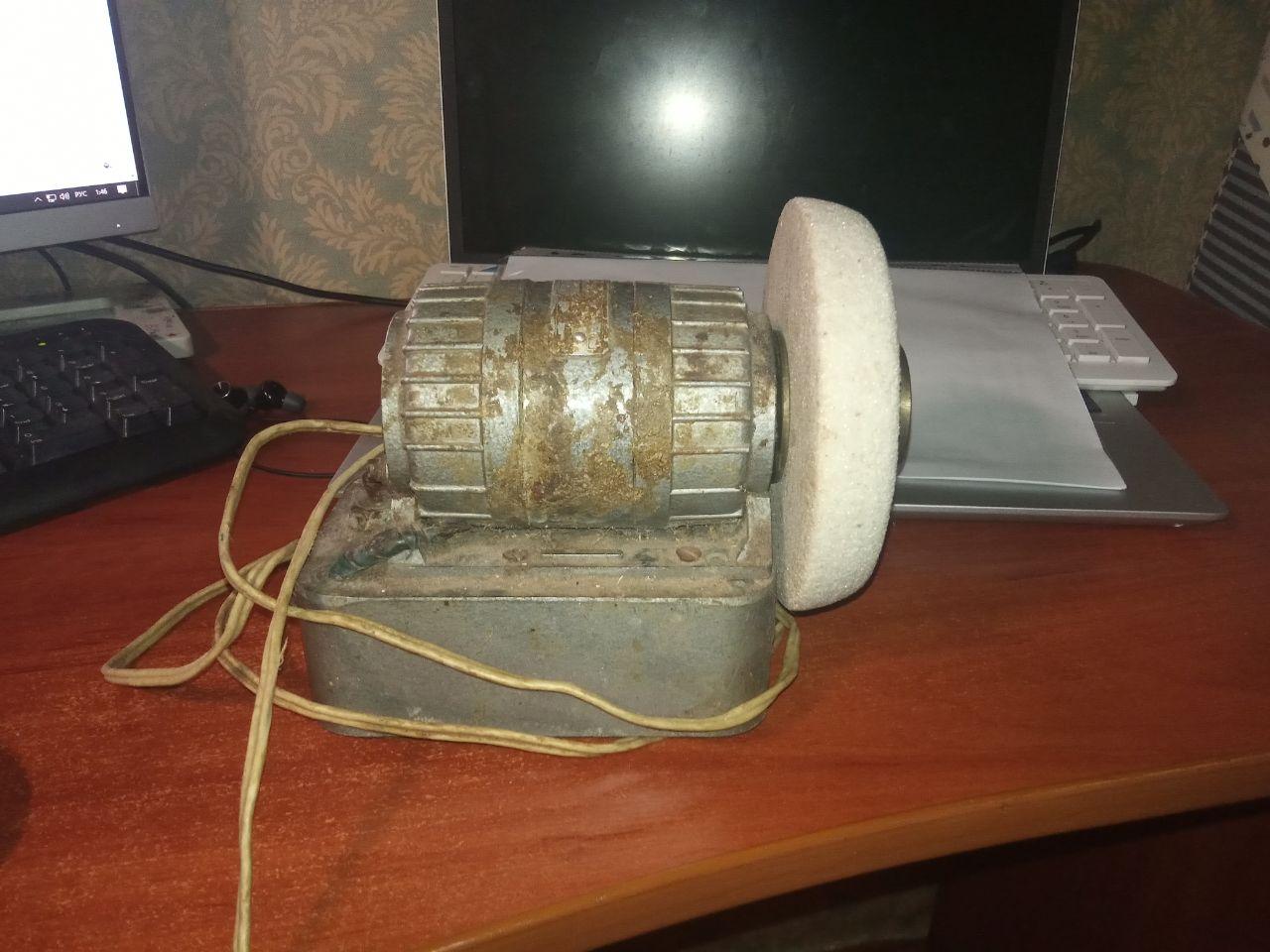 В начале 90-х, когда настали суровые времена, все выживали, как могли. Батя работал токарем на заводе, мама в библиотеке. Тогда зарплату не платили по полгода, а то и больше. Батя начал таскать с завода электродвигатели небольшие 0.8 – 1.5 кВт. Делал из них наждаки, вытачивал насадки на вал для шлифовального круга, делал красивую крашеную подставку, выключатель, распайку под 220В с конденсаторами.