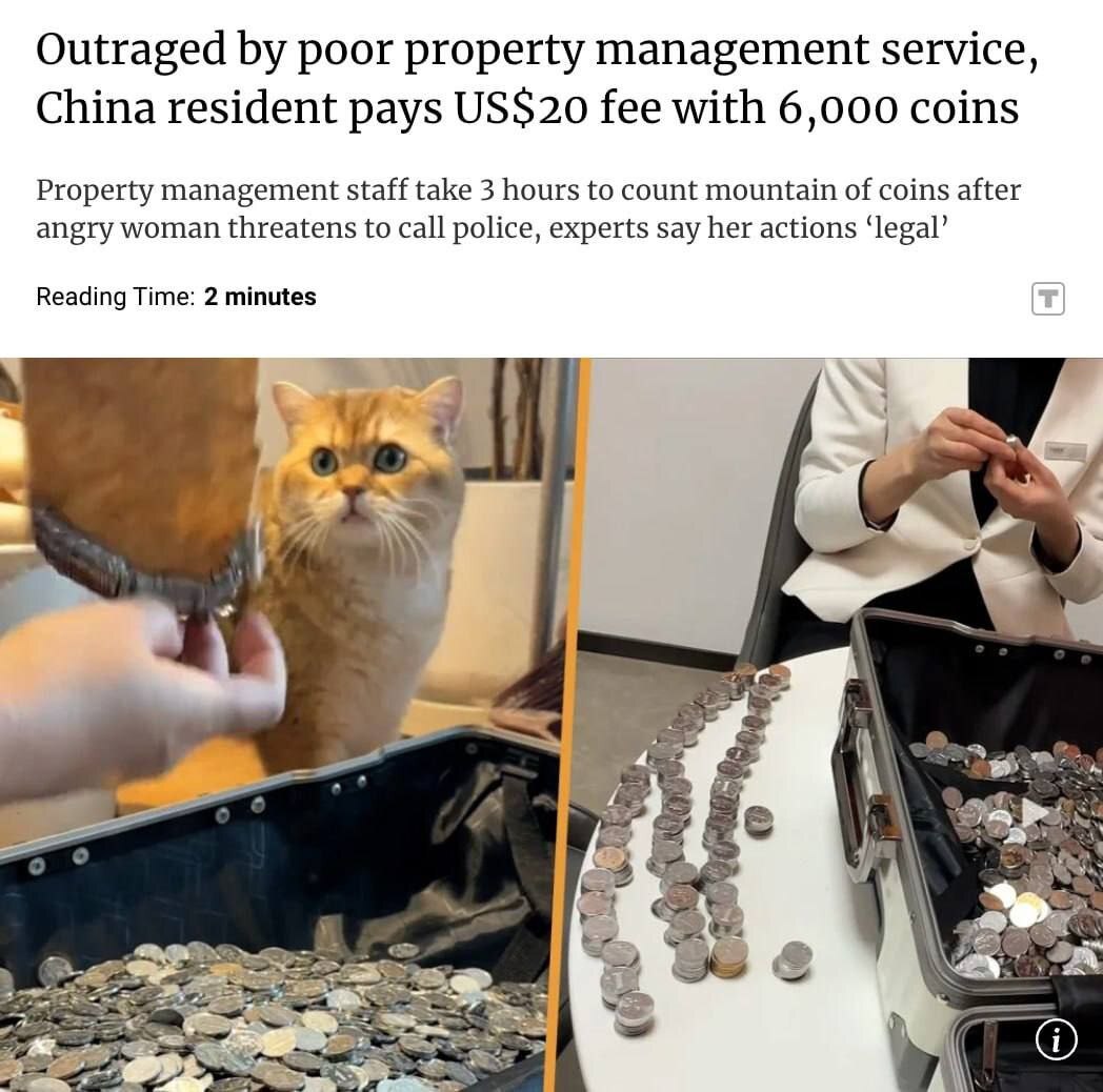 Жительница Китая принесла в управляющую компанию 6000 монет, чтобы оплатить счёт за коммуналку на $20. Так она отомстила за плохой сервис — сотрудники три часа пересчитывали деньги. Ранее в УК отказались решать проблемы в доме, заявив, что это не входит в их обязанности, но при этом требовали оплату. Когда женщине предложили заплатить комиссию за возможность внести платёж, она согласилась — и принесла деньги в чемодане, набитом мелочью.