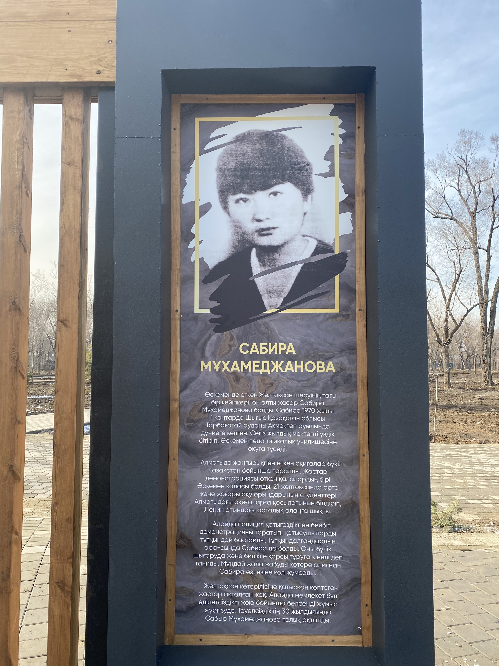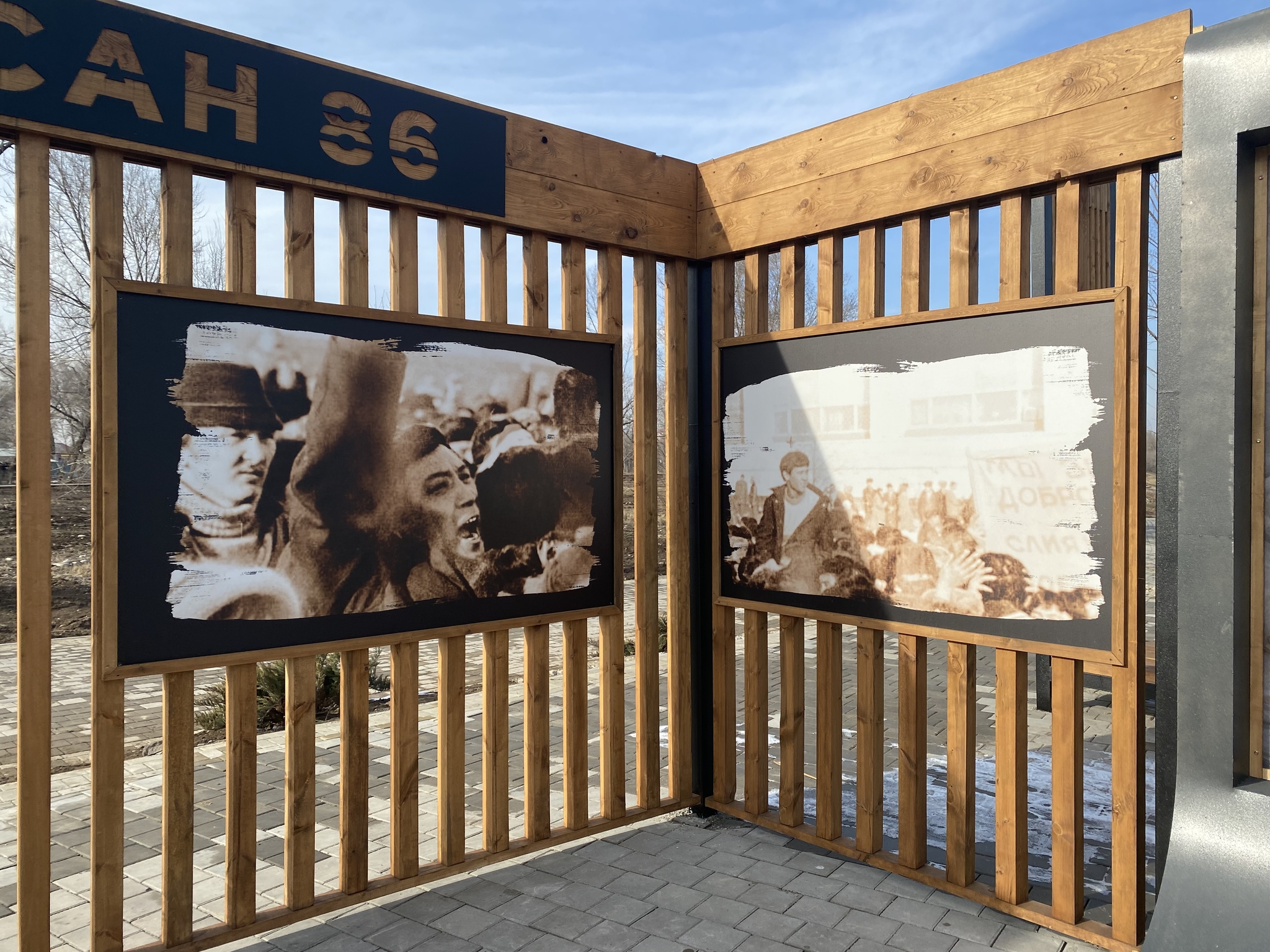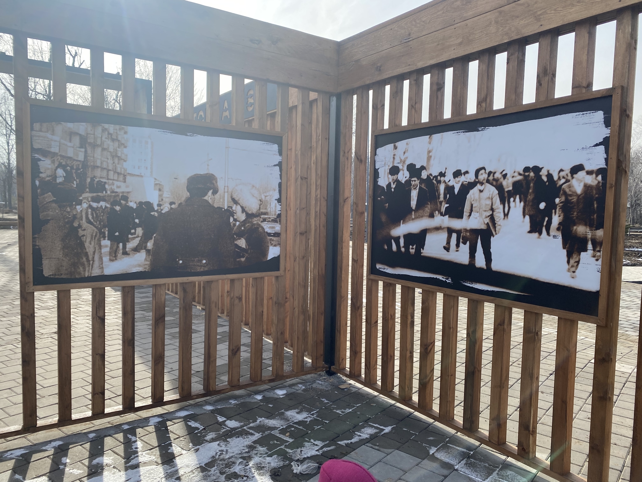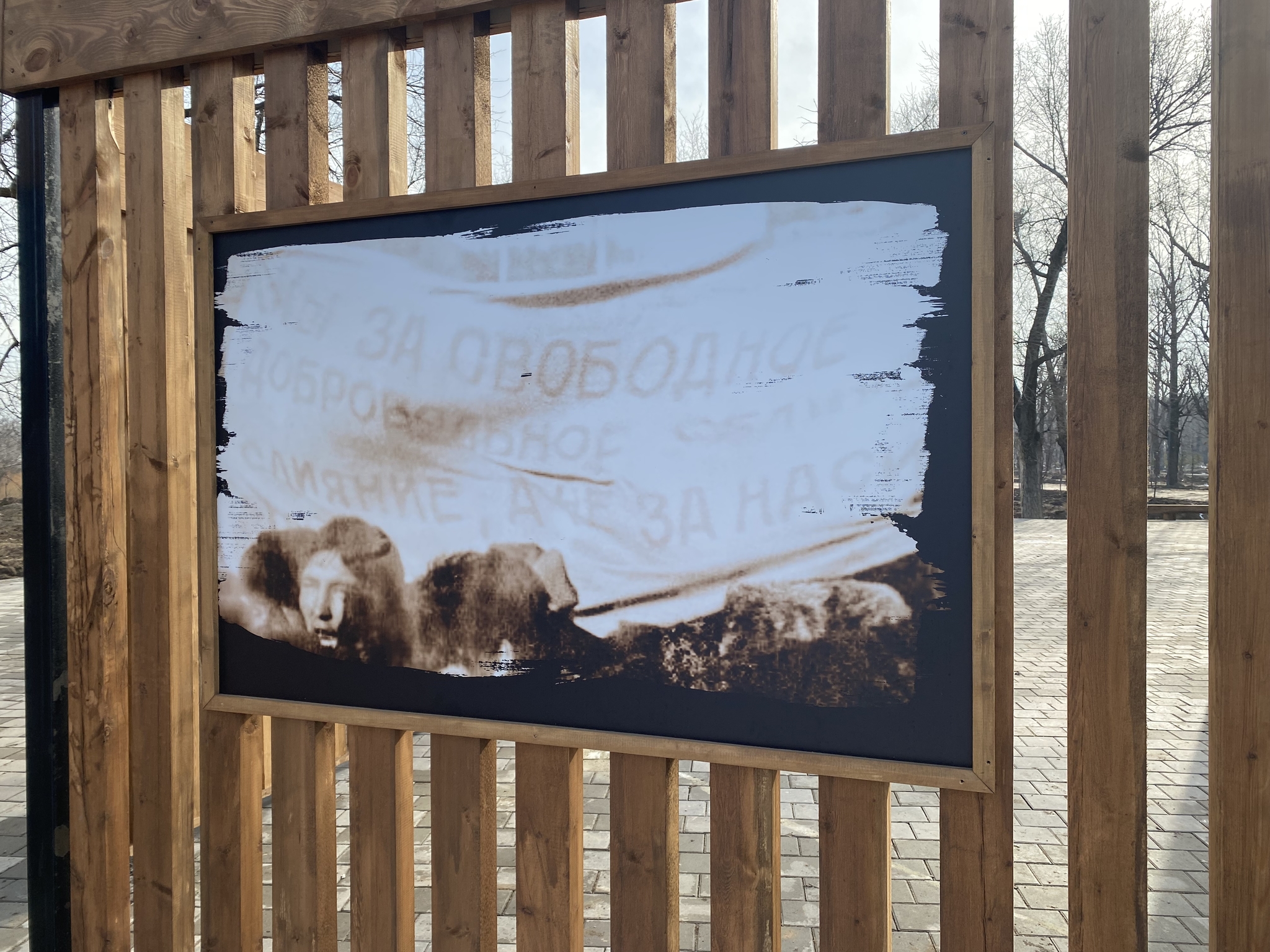В конце парка сделаны инсталляции с фотографиями тех времён и цитатой президента.