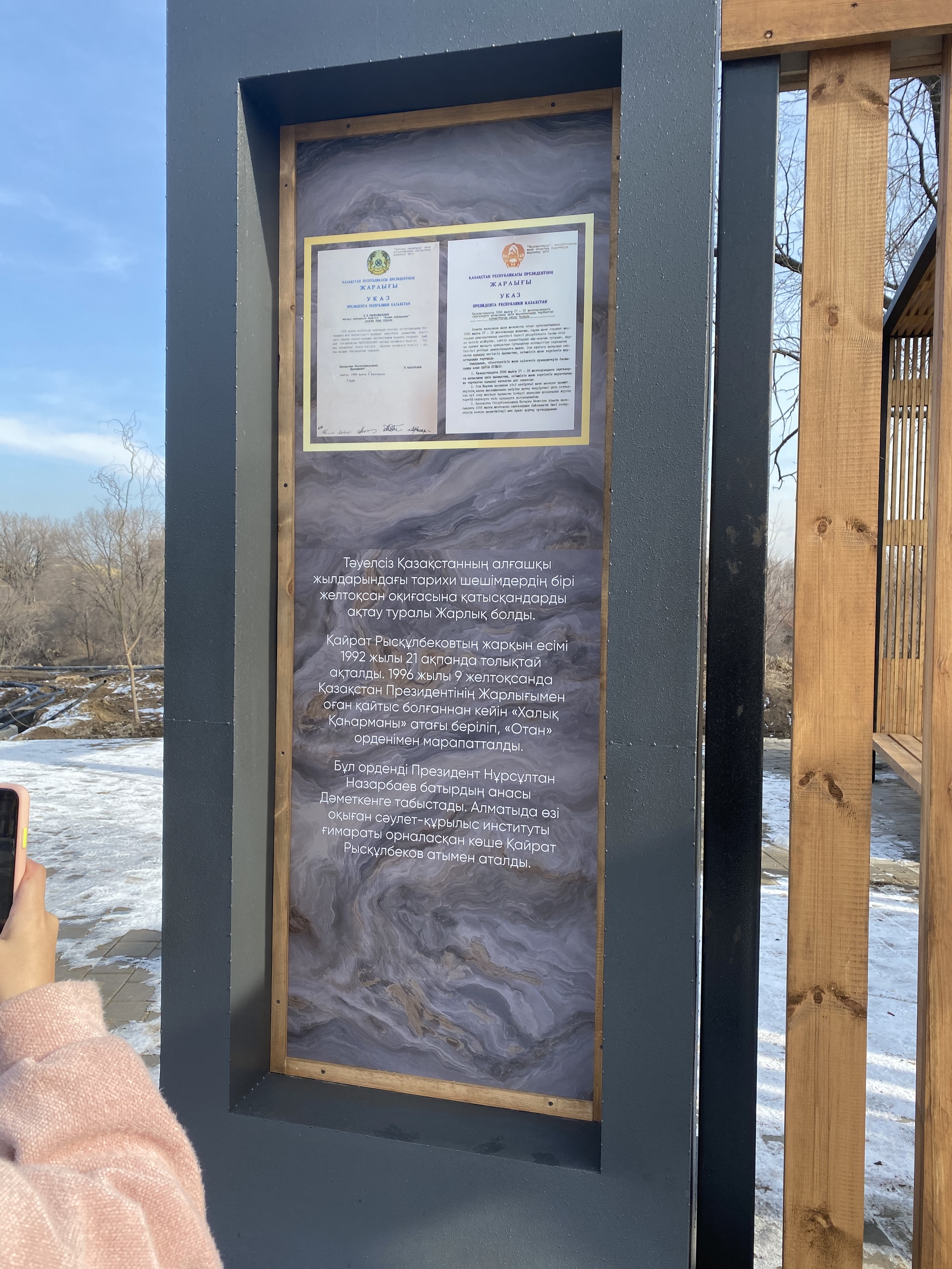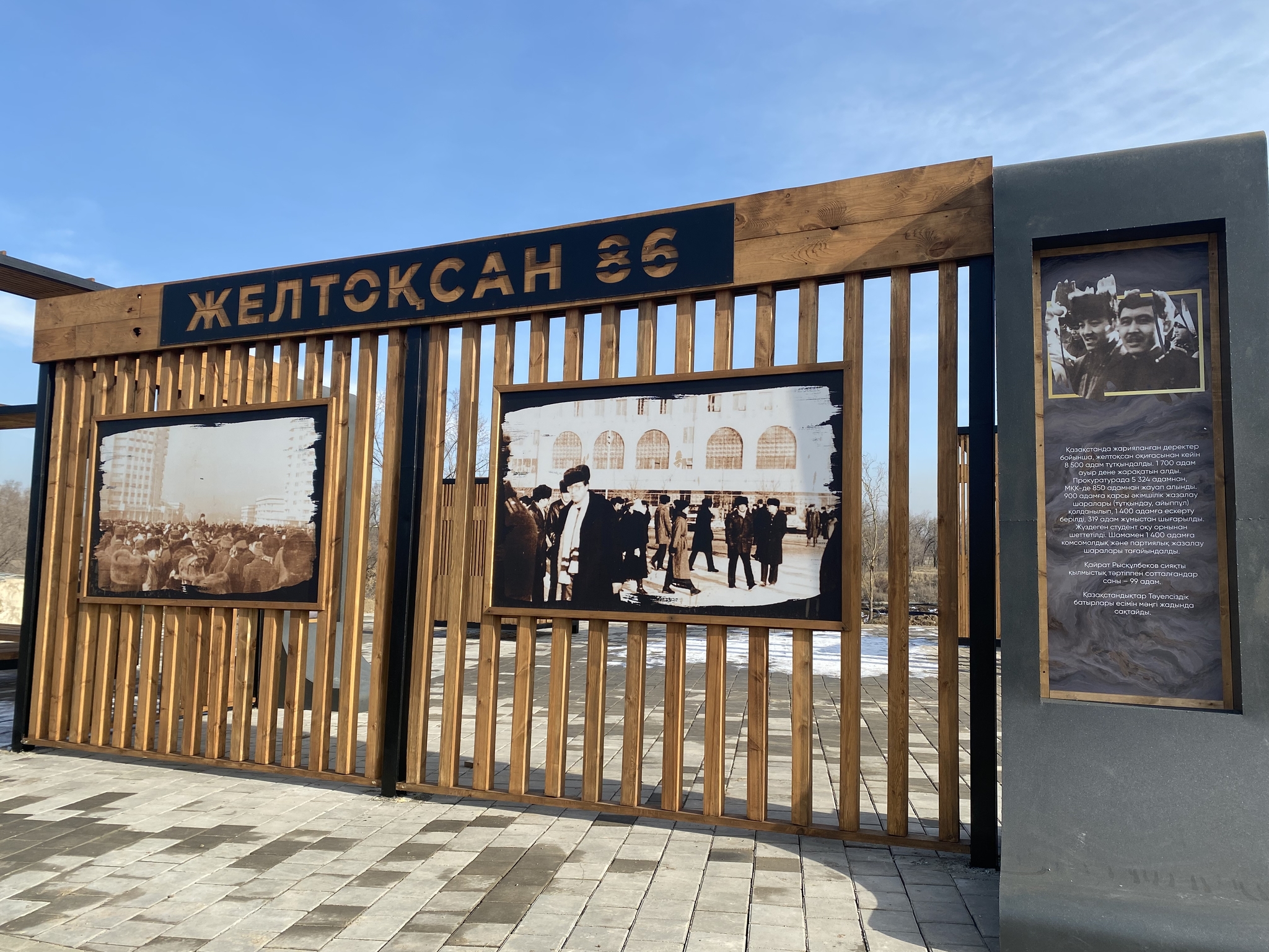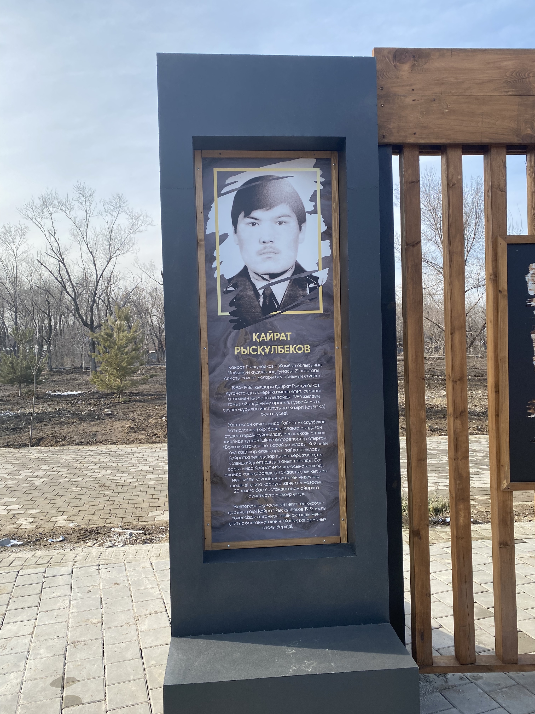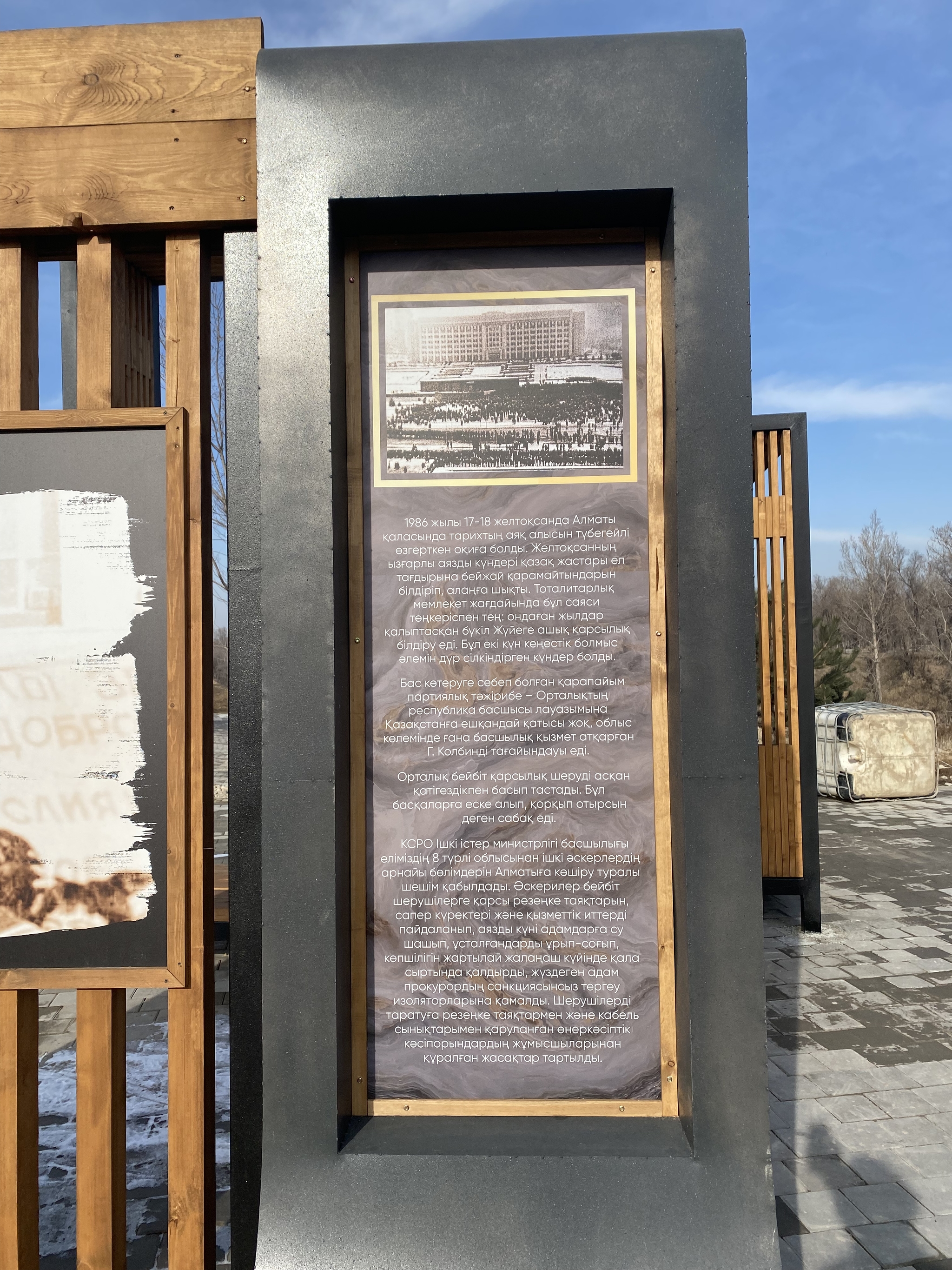 В конце парка сделаны инсталляции с фотографиями тех времён и цитатой президента.