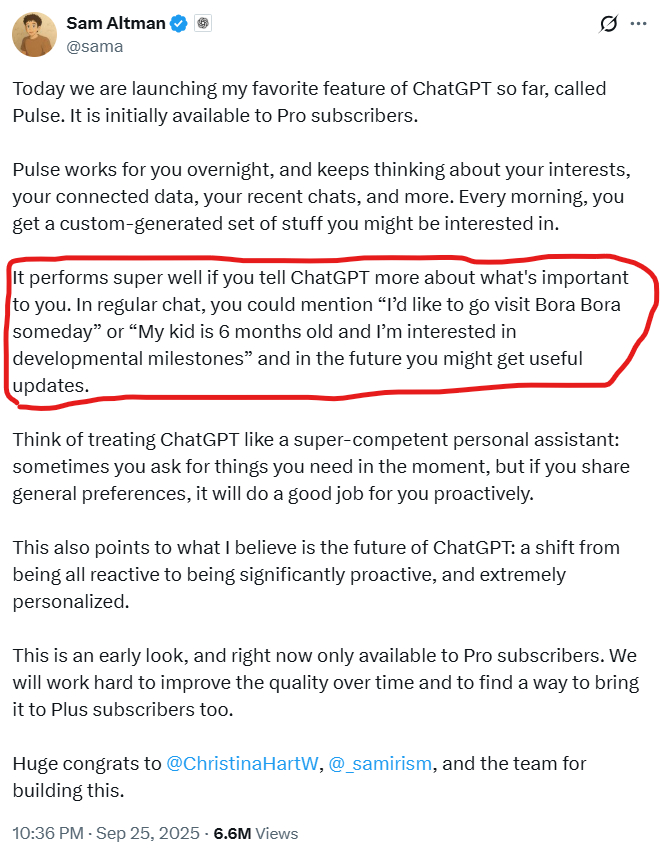 🐌 Еще OpenAI набирает команду для запуска рекламы в ChatGPT. Там же выкатили для Pro-юзеров нового ассистента Pulse – он за ночь собирает всю инфу, которую вы записали днем, и на следующее утро выдает вам персонифицированные карточки, которые вроде как должны вам помочь настроиться на продуктивный день.