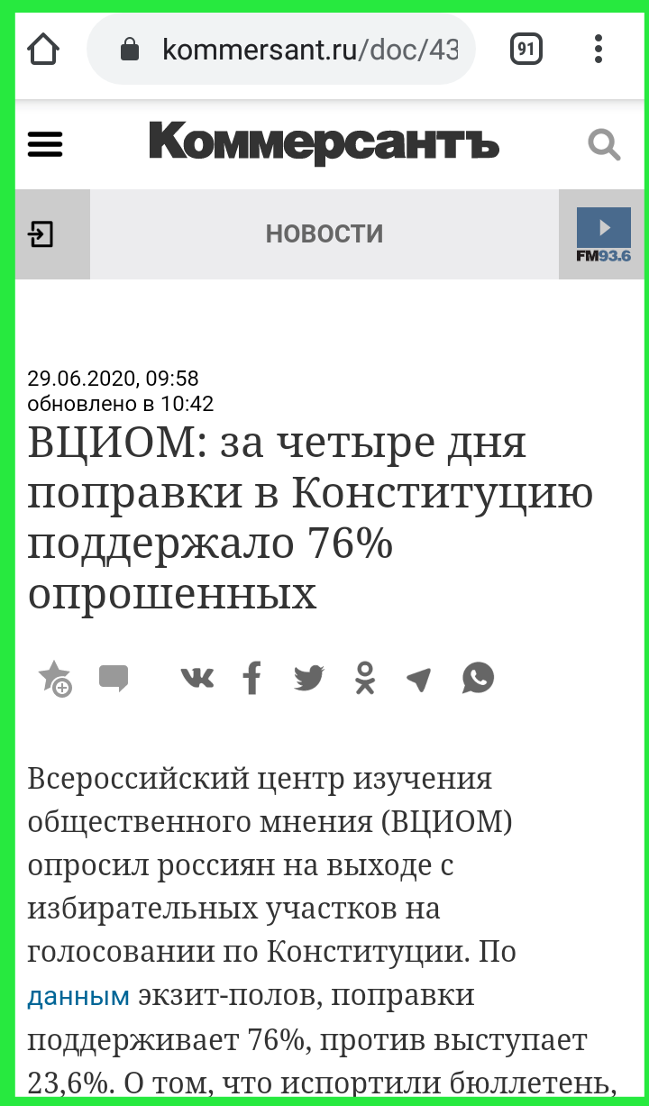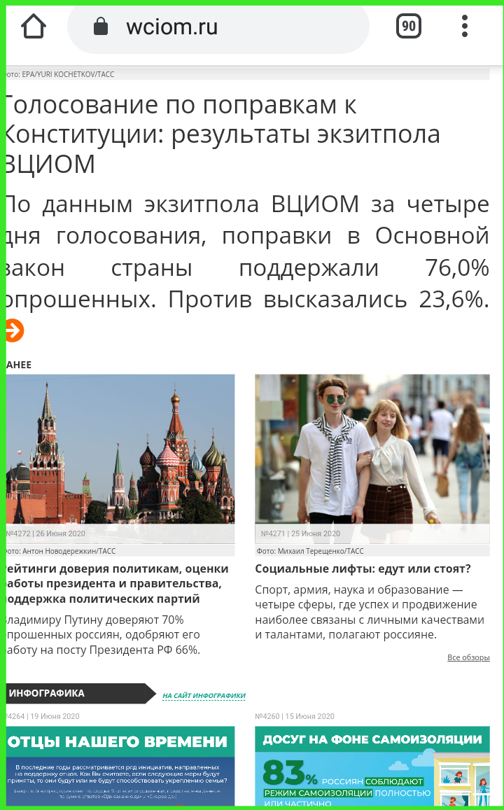 1) Заголовок статьи с отчетом об экзитполах с сайта ВЦИОМ, в котором ошибочно написано, что поправки поддержали 76% опрошенных, а не 53%