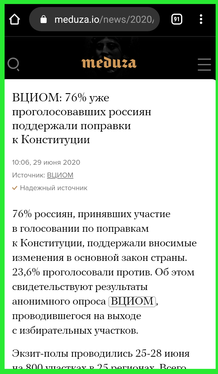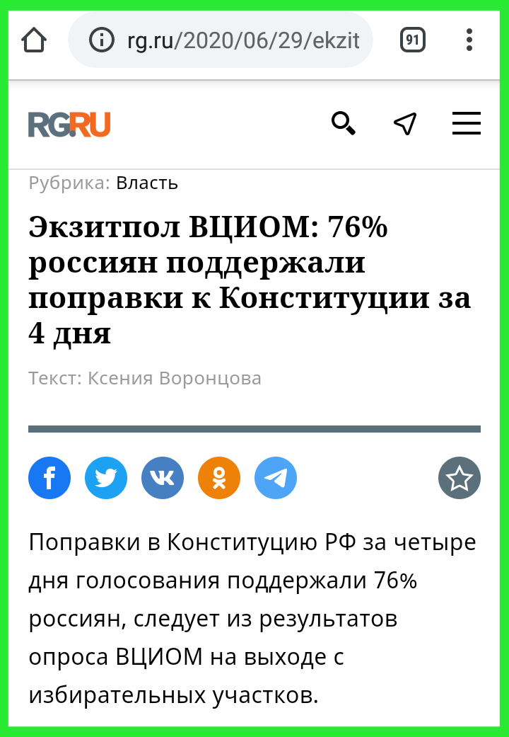 А РИА Новости и Российская газета додумались до вообще "76% россиян за". Это 106 миллионов человек. При этом на утро 30 июня всего проголосовало 49,6 млн россиян.