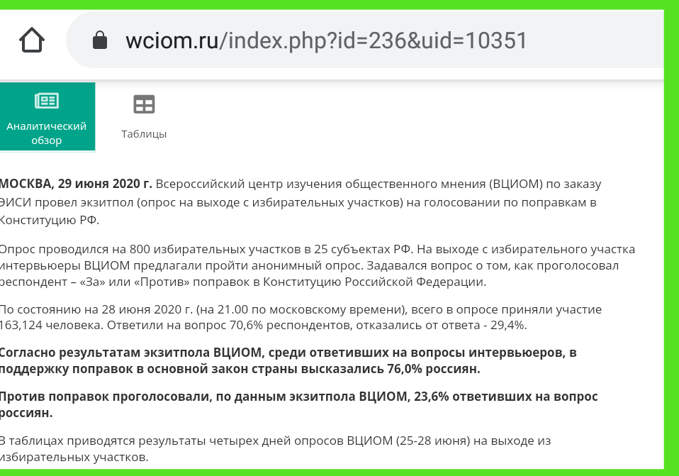 2) Отчёт с сайта ВЦИОМ, в котором написано, что на 800 участках в 25 регионах были опрошены 163124 человек, из них 29,4% отказались отвечать, как они проголосовали, а из 70,6% ответивших, в поддержку поправок высказались 76%, против - 23,6%.