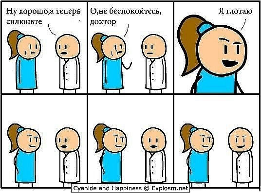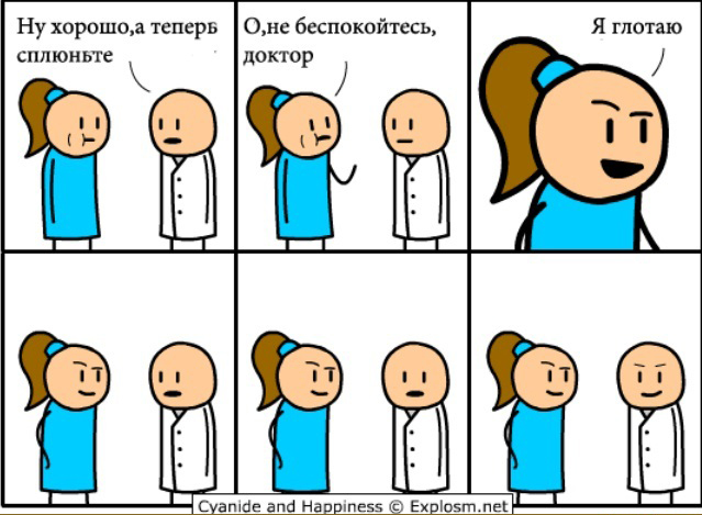 Это как стоим с подругой в Окее на кассе, очередь человек 8-10. Она вынимает жвачку, и прилепляет к стеллажу. Я ей говорю, мол, неприлично так, нехорошо. А она мне - нормально. Я - нет, не нормально. Она - а ты что в таких случаях делаешь? И я, почему-то громче обычного: Я глотаю!