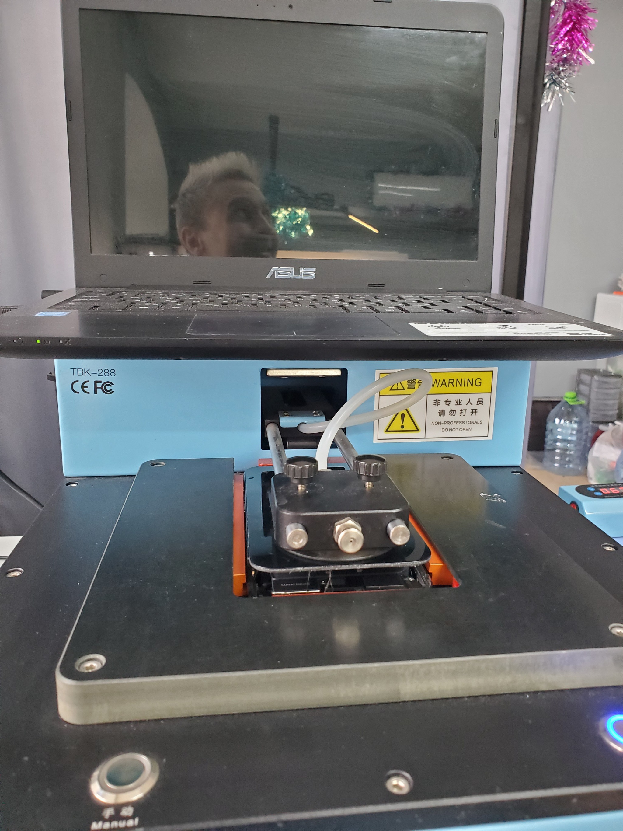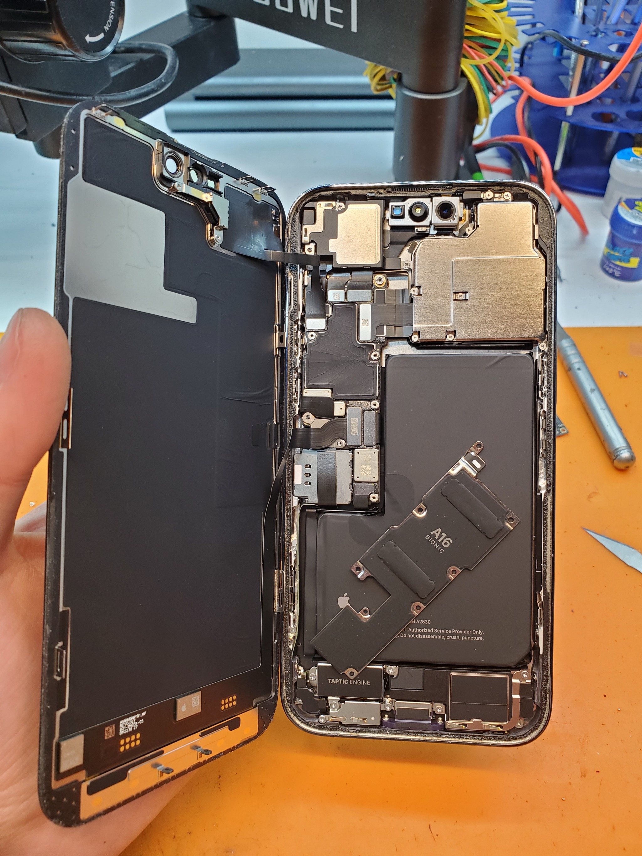 Двумя вакуумными присосками выдирает дисплей из корыта. Одна присоска крепится на заднюю крышку, а вторая на дисплей, предварительно нагревая металлическую раму по кругу до 80 градусов и потом постепенно сама поднимает дисплей.