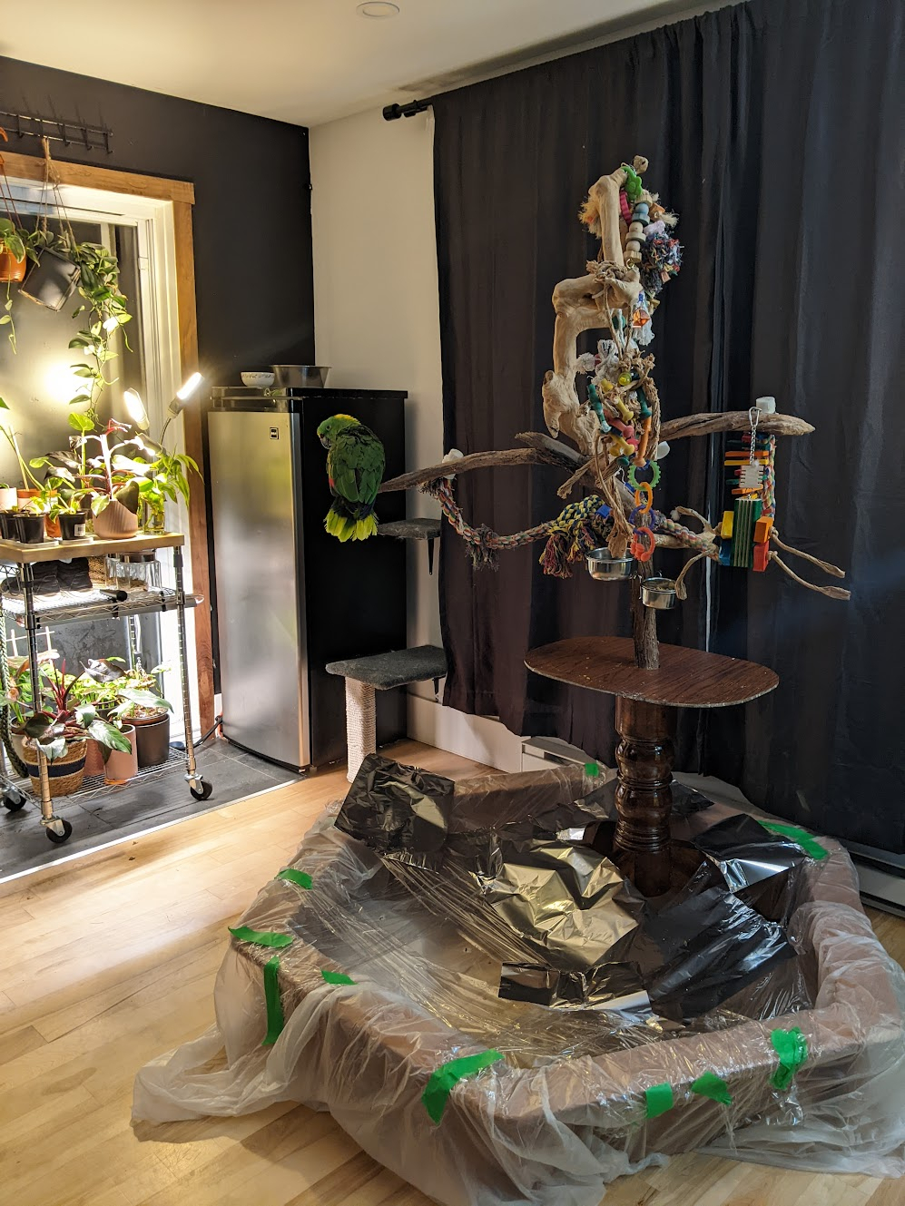 Вы скажете, а че он не в клетке? Он в клетке. Но выпускать летать его надо обязательно, иначе лёгким кабзда. И этой гадине пернатой хватает пары минут, чтоб нашкодить.