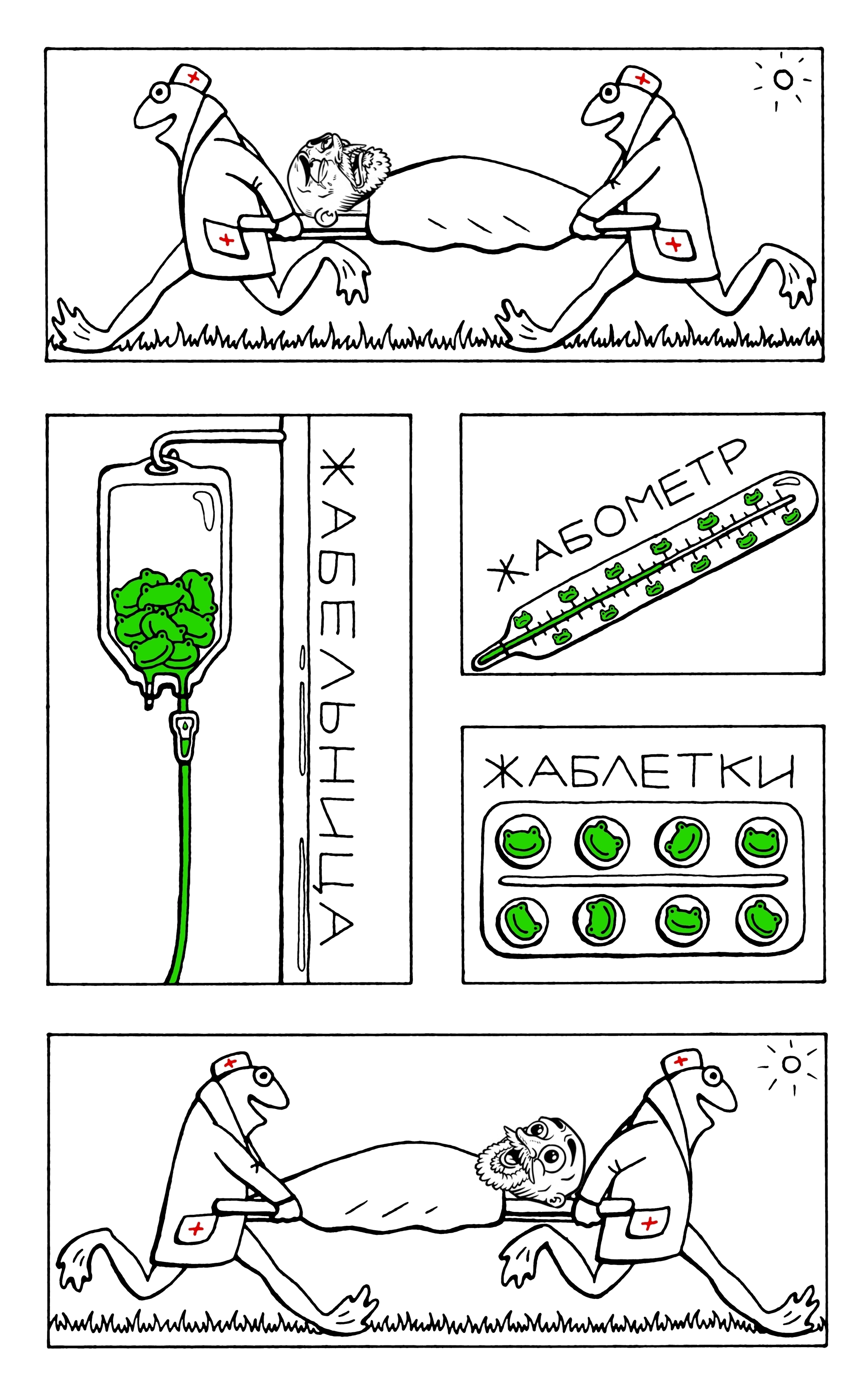 Комикс смотреть снизу вверх? В конце жмура тащат?! Или у пациента ног нет? Или это сатира на нашу медицину туда-сюда таскают, а вылечить нихера не могут?!