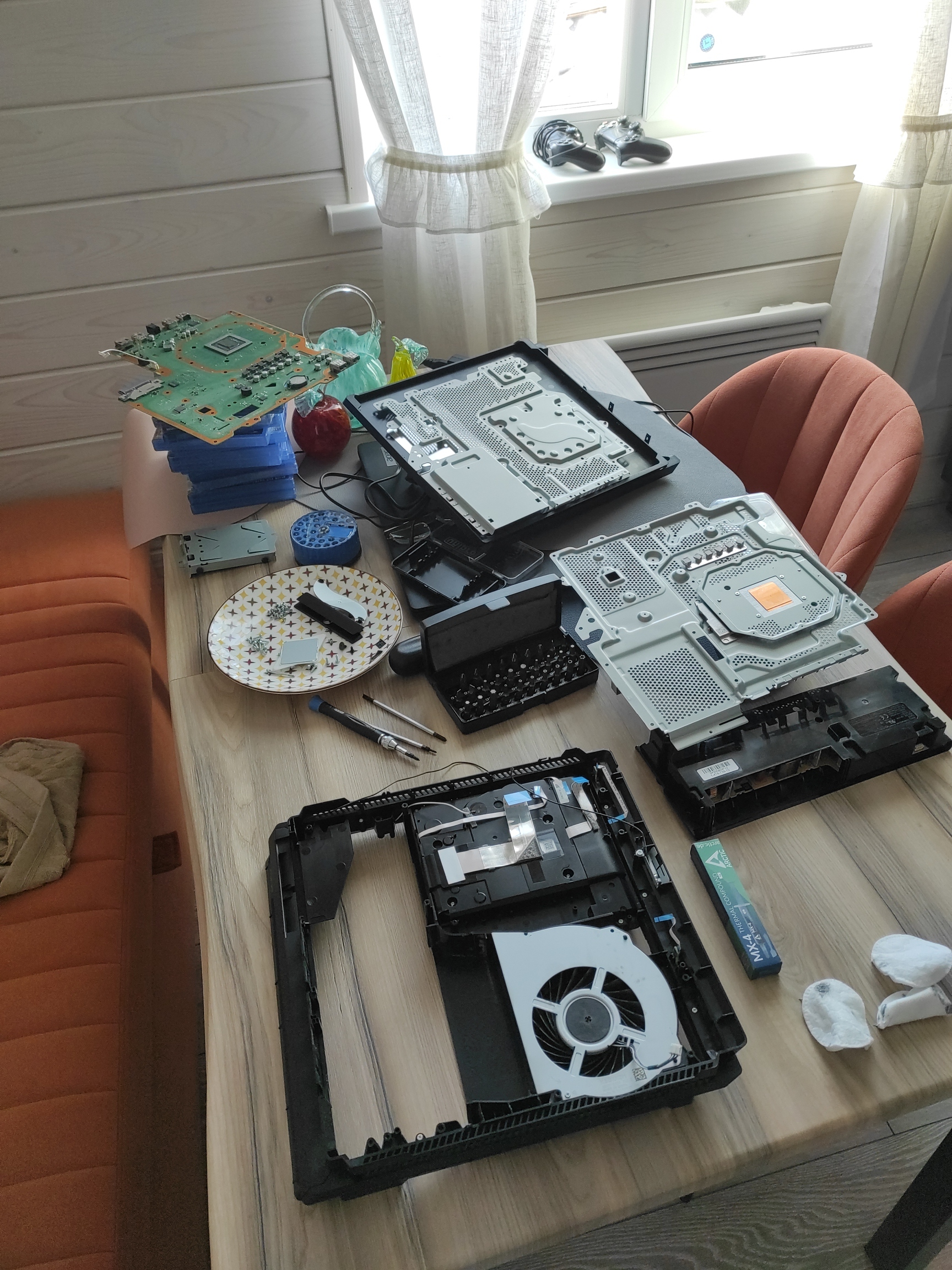 Давно все собирался заняться разбором приставки, т.к. шумит и греется не по детски. Ей уже много-много лет, детям даже уже и 5 подарили, но к четвертой есть много дисков да и перевез ее на дачу, чтобы наездами можно было поиграть, скоротать время в дождливую погоду, детям не скучать.