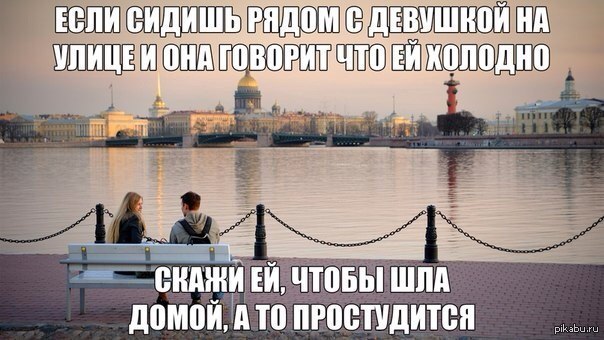 Главное не вздумай снимать с себя куртку/пиджак/шапку и одевать на нее, ибо сам замерзнешь и заболеешь. Помни, что девушек в мире много, а ты у мамы один.
