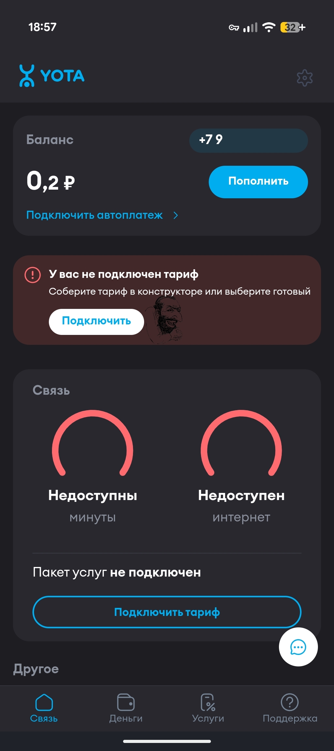 А где же я поел говна? Нет, не сверху, это была проба. Вот тут — самый смак. Я за дом интернет и ТВ платил не самые большие 550 р. (года 2 назад выцыганил условия). Теперь же с лицевого счёта снимают мобильную связь, но переводят меня на базовый тариф за 700 или 800 р., я уже не помню, и просто делают вид, что ничего не знают о старых условиях. Yota так же была у меня с индивидуальной скидкой. Когда вставил симку, был неприятно удивлён вот таким экраном.