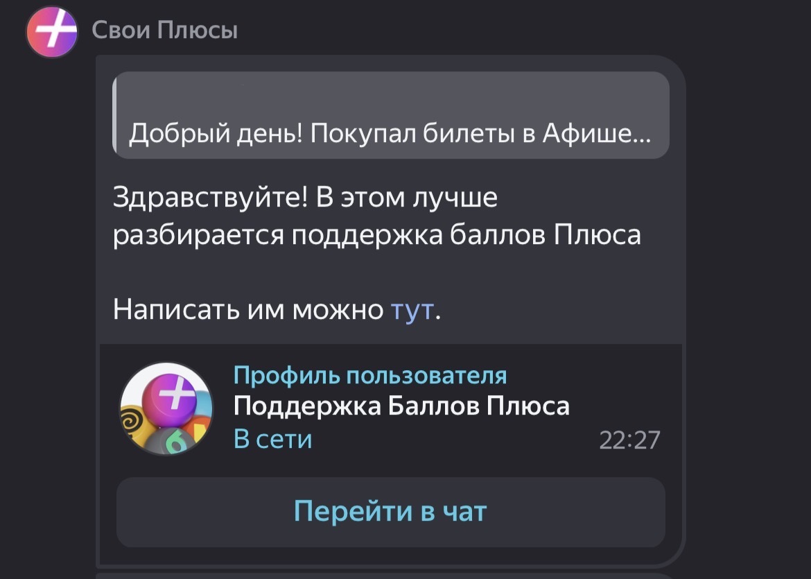 Пишу в поддержку программы лояльности Свои плюсы, где меня сразу отправляют в поддержку баллов плюса (отдельный вопрос, почему это разные поддержки и как их различать)